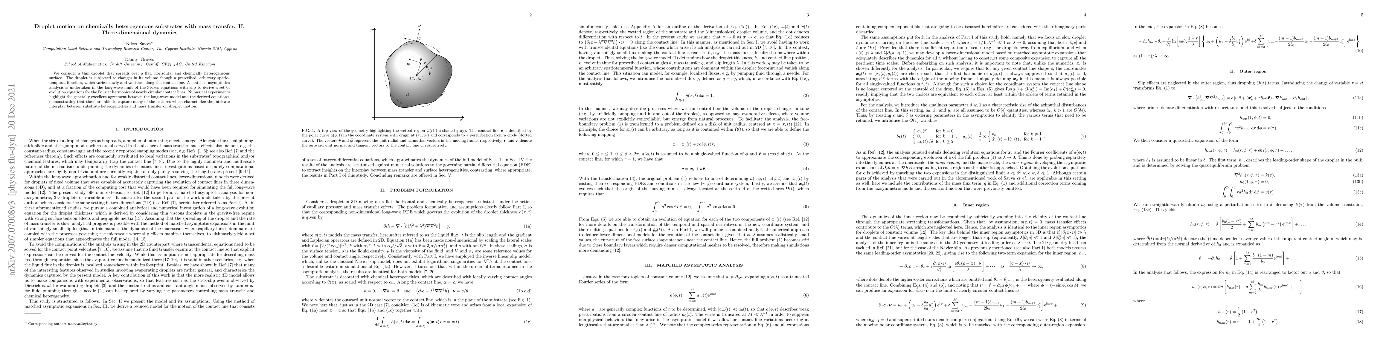 This paper investigates the three-dimensional dynamics of a thin droplet spreading over a chemically heterogeneous surface, with volume changes governed by a slow, spatiotemporal function. The study employs matched asymptotics to derive evolution equations for droplet motion, showing strong agreement with numerical simulations and capturing the complex interactions between substrate heterogeneities and mass transfer.