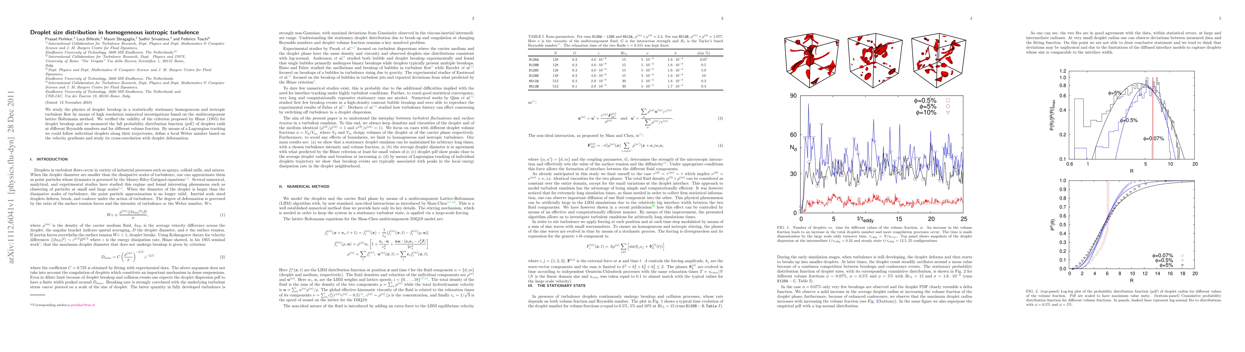 We study the physics of droplet breakup in a statistically stationary homogeneous and isotropic turbulent flow by means of high resolution numerical investigations based on the multicomponent lattice Boltzmann method. We verified the validity of the criterion proposed by Hinze (1955) for droplet breakup and we measured the full probability distribution function (pdf) of droplets radii at different Reynolds numbers and for different volume fraction. By means of a Lagrangian tracking we could follow individual droplets along their trajectories, define a local Weber number based on the velocity gradients and study its cross-correlation with droplet deformation.