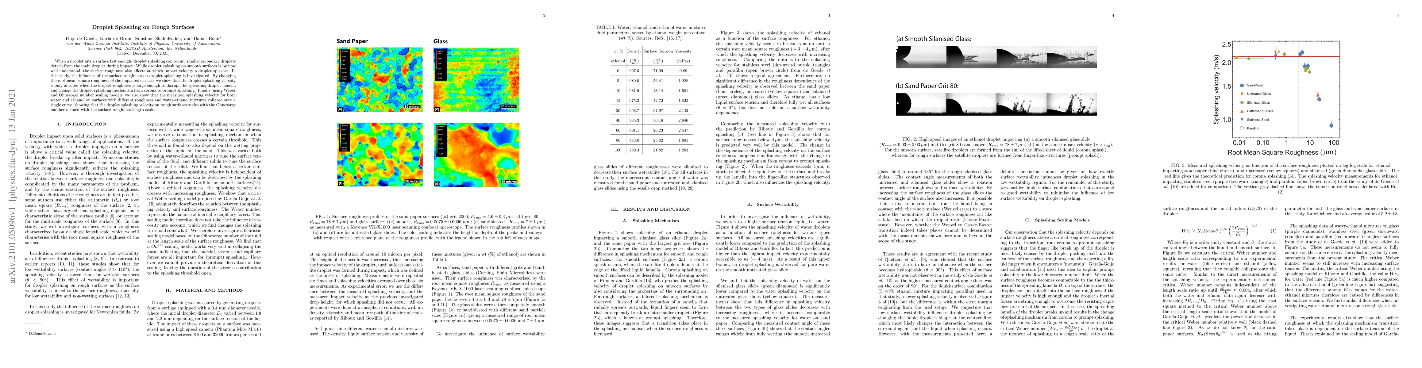 This study investigates how surface roughness influences droplet splashing, showing that splashing velocity is affected only when the droplet's roughness disrupts the spreading lamella, changing the splashing mechanism. The results collapse onto a single curve using Ohnesorge number scaling, indicating splashing velocity scales with the Ohnesorge number considering surface roughness.