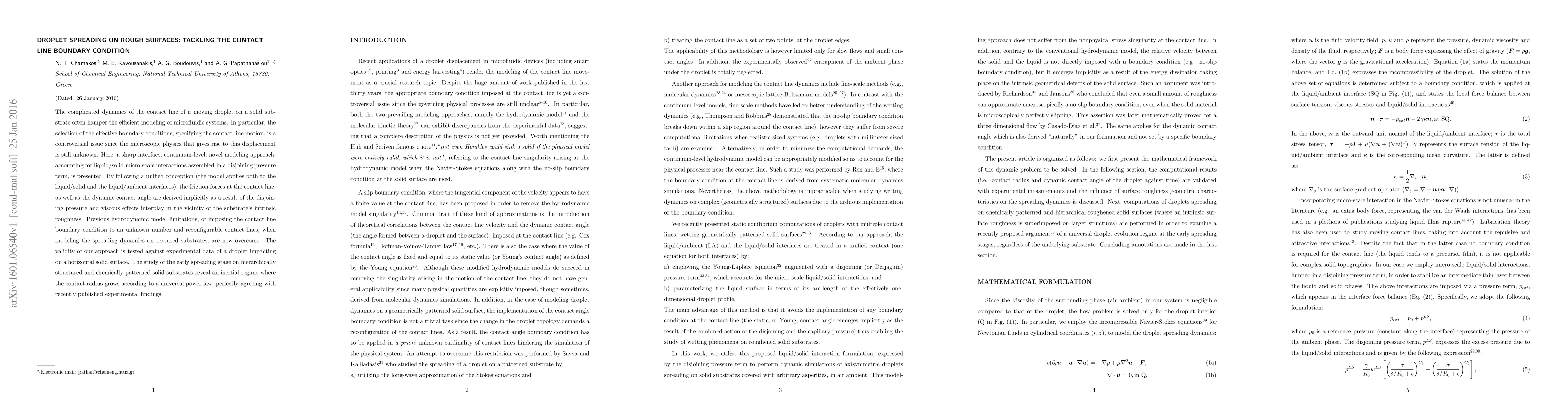 This research introduces a novel continuum-level modeling approach to better understand droplet spreading dynamics on rough surfaces by incorporating micro-scale liquid/solid interactions into a disjoining pressure term. The new model implicitly derives friction forces and dynamic contact angles, overcoming previous limitations in hydrodynamic models. Experimental validation shows the model accurately predicts the early spreading stage on textured substrates.