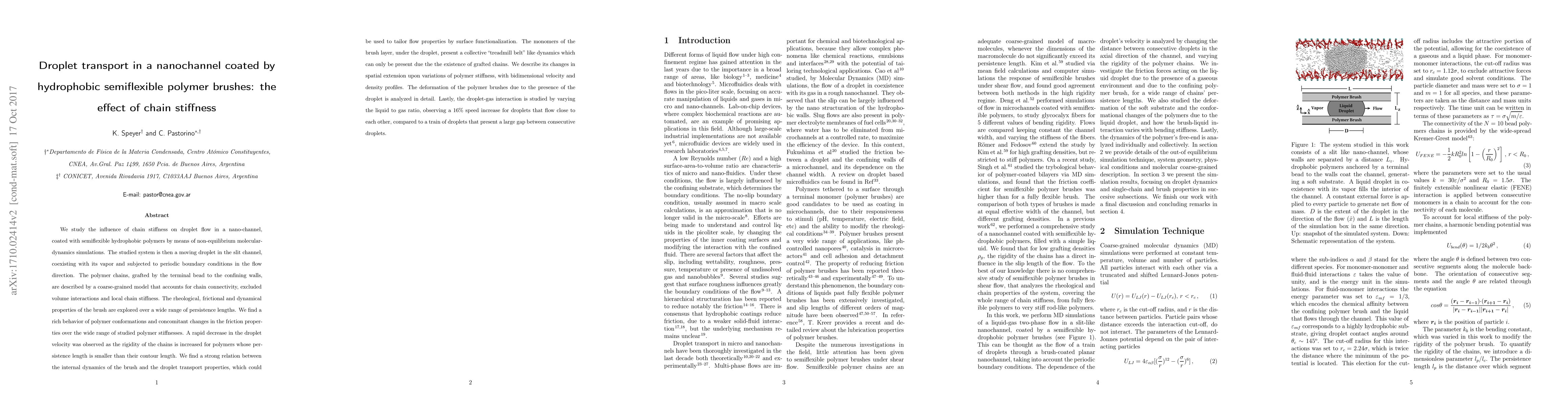 This research investigates how varying the stiffness of semiflexible hydrophobic polymer brushes affects droplet transport in a nanochannel using molecular-dynamics simulations. The study reveals a significant decrease in droplet velocity with increased polymer chain rigidity, highlighting the potential to tailor flow properties through surface functionalization.