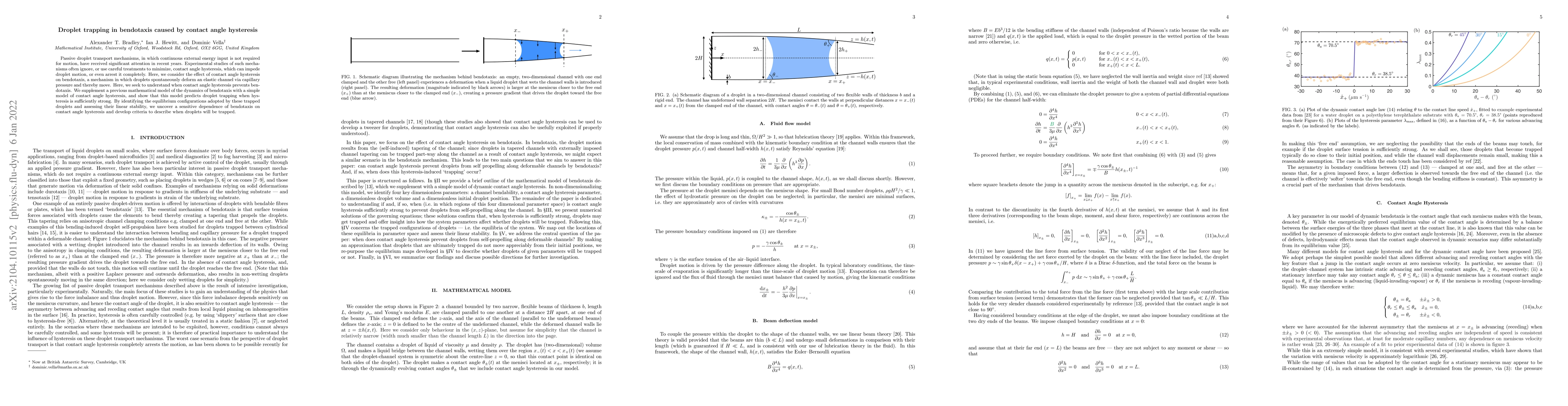 Passive droplet transport mechanisms, in which continuous external energy input is not required for motion, have received significant attention in recent years. Experimental studies of such mechanisms often ignore, or use careful treatments to minimize, contact angle hysteresis, which can impede droplet motion, or even arrest it completely. Here, we consider the effect of contact angle hysteresis on bendotaxis, a mechanism in which droplets spontaneously deform an elastic channel via capillary pressure and thereby move. Here, we seek to understand when contact angle hysteresis prevents bendotaxis. We supplement a previous mathematical model of the dynamics of bendotaxis with a simple model of contact angle hysteresis, and show that this model predicts droplet trapping when hysteresis is sufficiently strong. By identifying the equilibrium configurations adopted by these trapped droplets and assessing their linear stability, we uncover a sensitive dependence of bendotaxis on contact angle hysteresis and develop criteria to describe when droplets will be trapped.