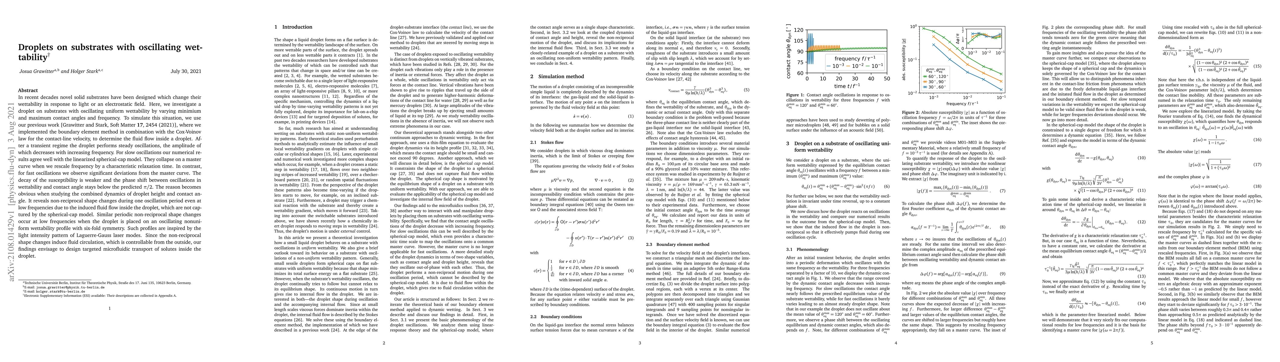This paper investigates droplets on substrates with oscillating wettability, finding that droplet oscillations depend on frequency and wettability variation. While slow oscillations match a linearized model, fast oscillations show significant deviations due to non-reciprocal shape changes and internal fluid flow, suggesting potential for targeted microfluidic transport.