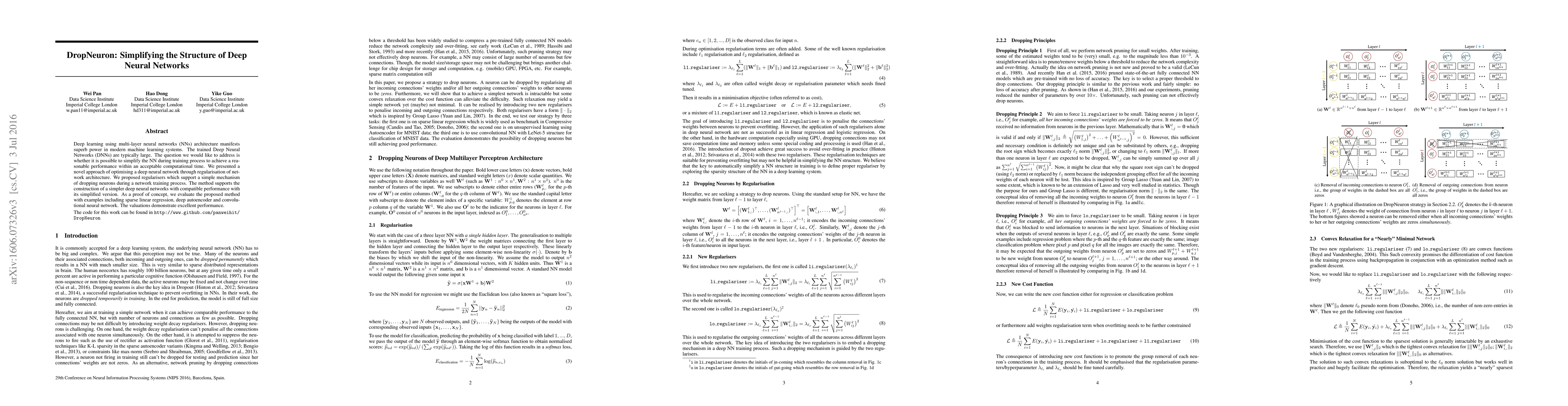 Deep learning using multi-layer neural networks (NNs) architecture manifests superb power in modern machine learning systems. The trained Deep Neural Networks (DNNs) are typically large. The question we would like to address is whether it is possible to simplify the NN during training process to achieve a reasonable performance within an acceptable computational time. We presented a novel approach of optimising a deep neural network through regularisation of net- work architecture. We proposed regularisers which support a simple mechanism of dropping neurons during a network training process. The method supports the construction of a simpler deep neural networks with compatible performance with its simplified version. As a proof of concept, we evaluate the proposed method with examples including sparse linear regression, deep autoencoder and convolutional neural network. The valuations demonstrate excellent performance. The code for this work can be found in http://www.github.com/panweihit/DropNeuron