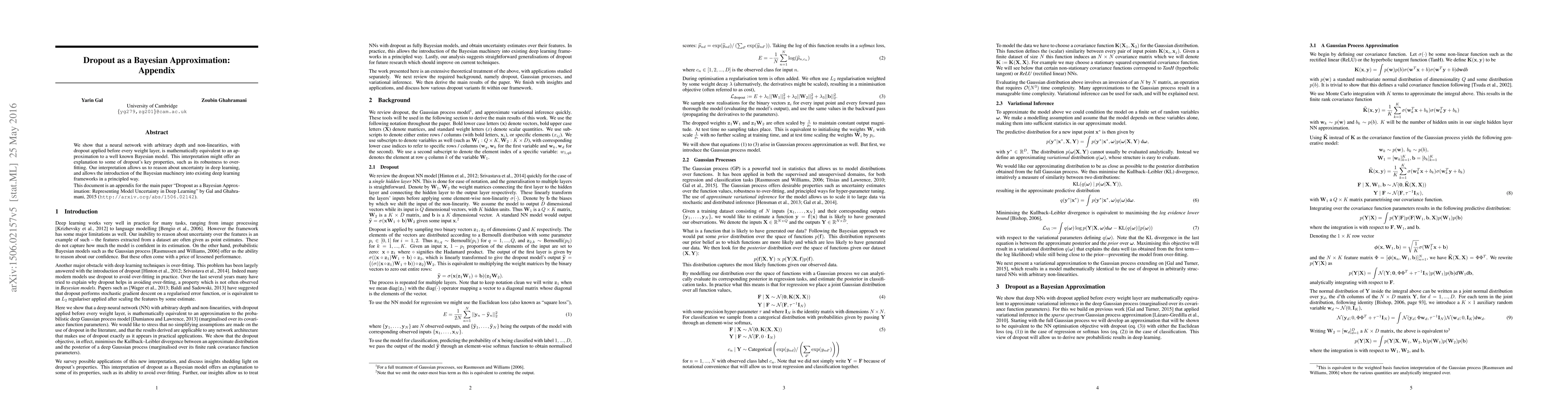 This appendix to the main paper "Dropout as a Bayesian Approximation" by Gal and Ghahramani (2015) demonstrates that dropout in neural networks can be viewed as a Bayesian approximation, providing insights into dropout's robustness and enabling the integration of Bayesian techniques into deep learning frameworks.
