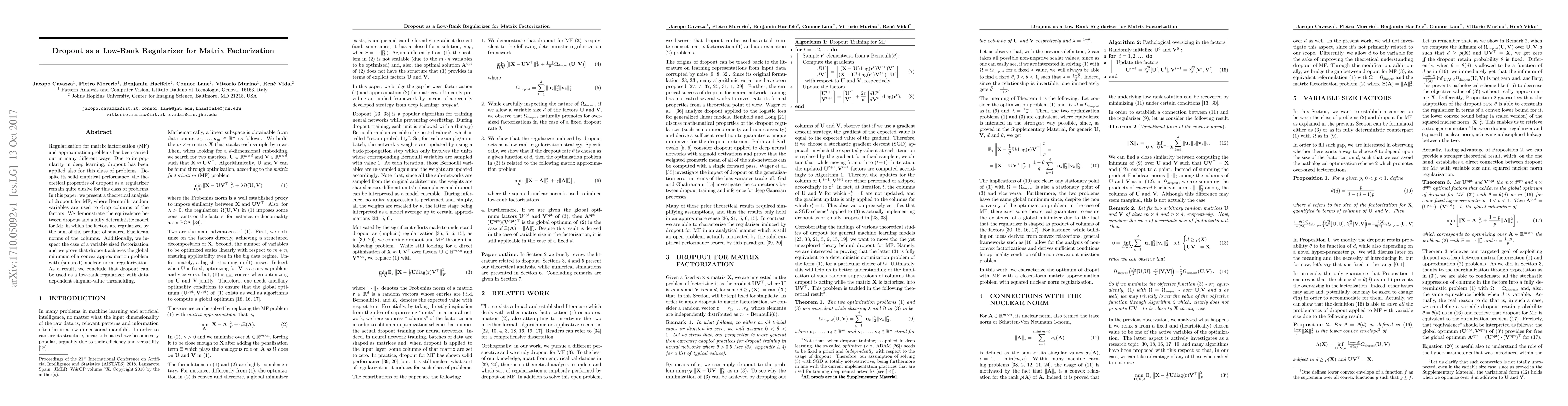 This paper analyzes dropout as a regularizer for matrix factorization, showing its equivalence to deterministic models with squared Euclidean norm regularization. It also proves that dropout achieves the global minimum of a convex approximation problem with nuclear norm regularization.