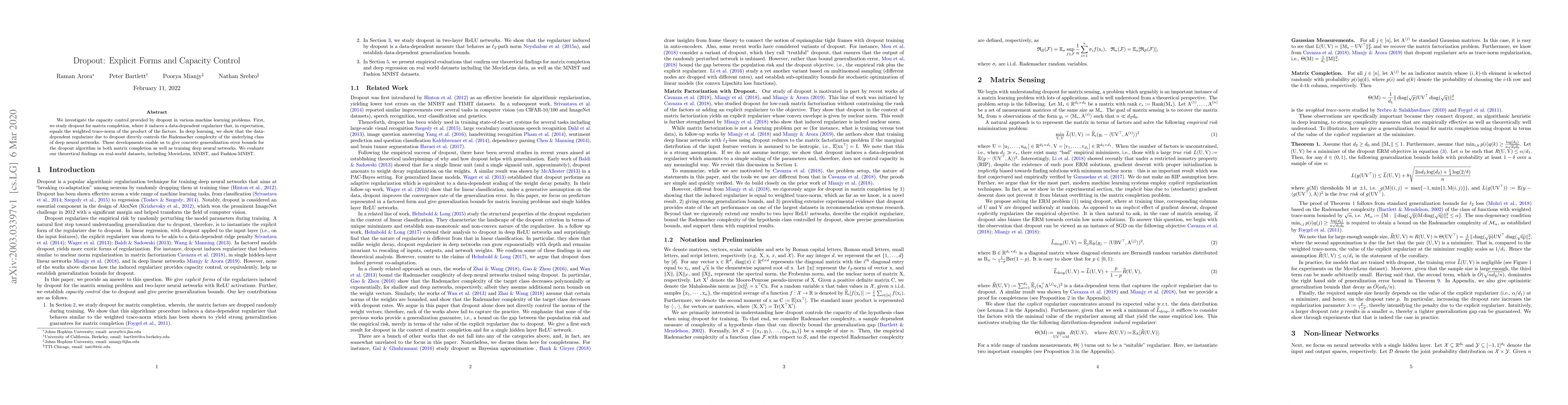 This paper explores how dropout functions as a data-dependent regularizer in machine learning, providing capacity control and enabling generalization error bounds for both matrix completion and deep neural networks. Theoretical insights are validated through experiments on datasets like MovieLens, MNIST, and Fashion-MNIST.