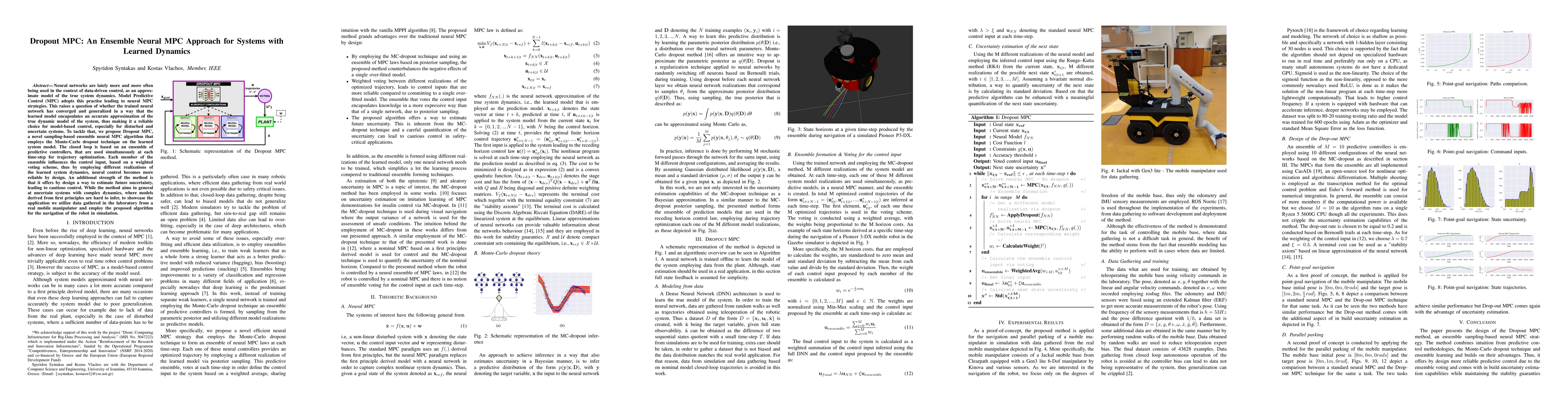 The paper proposes Dropout MPC, an ensemble neural MPC approach that uses Monte-Carlo dropout on an ensemble of predictive controllers to enhance reliability and uncertainty estimation in model-based control for uncertain systems. Demonstrated through a mobile manipulator's navigation simulation, it shows improved control performance and uncertainty estimation.