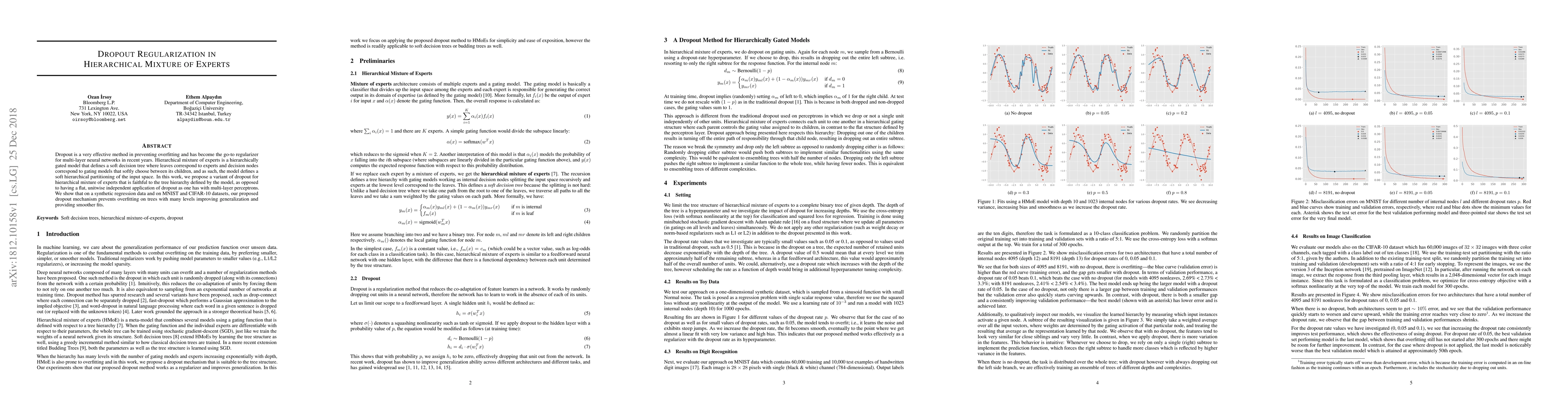 This paper proposes a specialized dropout regularization technique for hierarchical mixture of experts, which respects the model's tree hierarchy. The new method improves overfitting prevention and generalization performance on synthetic, MNIST, and CIFAR-10 datasets compared to traditional dropout.