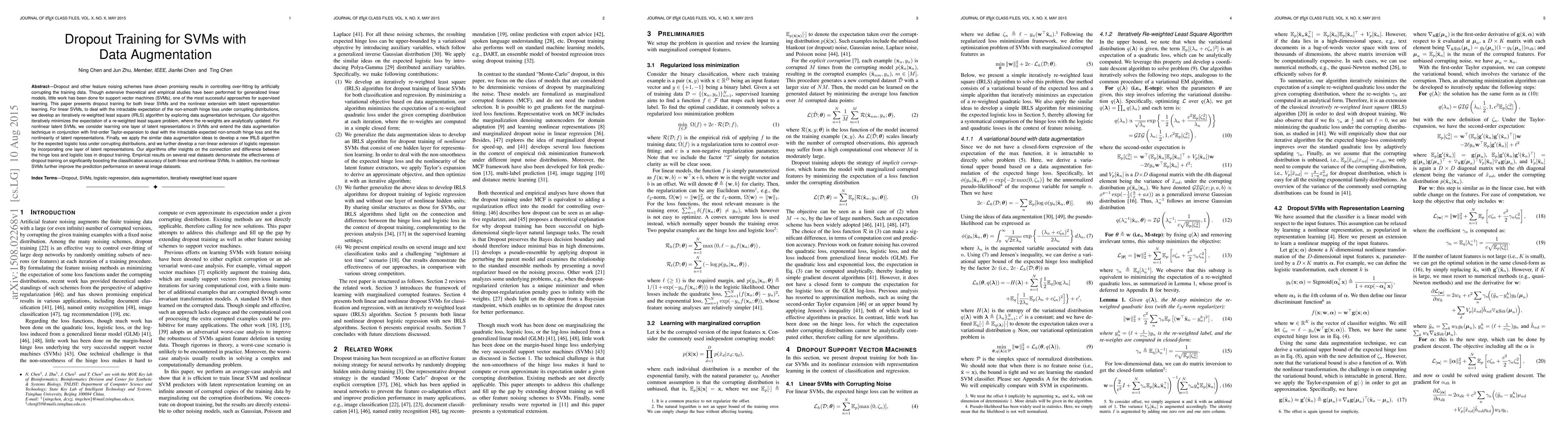 Dropout and other feature noising schemes have shown promising results in controlling over-fitting by artificially corrupting the training data. Though extensive theoretical and empirical studies have been performed for generalized linear models, little work has been done for support vector machines (SVMs), one of the most successful approaches for supervised learning. This paper presents dropout training for both linear SVMs and the nonlinear extension with latent representation learning. For linear SVMs, to deal with the intractable expectation of the non-smooth hinge loss under corrupting distributions, we develop an iteratively re-weighted least square (IRLS) algorithm by exploring data augmentation techniques. Our algorithm iteratively minimizes the expectation of a re-weighted least square problem, where the re-weights are analytically updated. For nonlinear latent SVMs, we consider learning one layer of latent representations in SVMs and extend the data augmentation technique in conjunction with first-order Taylor-expansion to deal with the intractable expected non-smooth hinge loss and the nonlinearity of latent representations. Finally, we apply the similar data augmentation ideas to develop a new IRLS algorithm for the expected logistic loss under corrupting distributions, and we further develop a non-linear extension of logistic regression by incorporating one layer of latent representations. Our algorithms offer insights on the connection and difference between the hinge loss and logistic loss in dropout training. Empirical results on several real datasets demonstrate the effectiveness of dropout training on significantly boosting the classification accuracy of both linear and nonlinear SVMs. In addition, the nonlinear SVMs further improve the prediction performance on several image datasets.