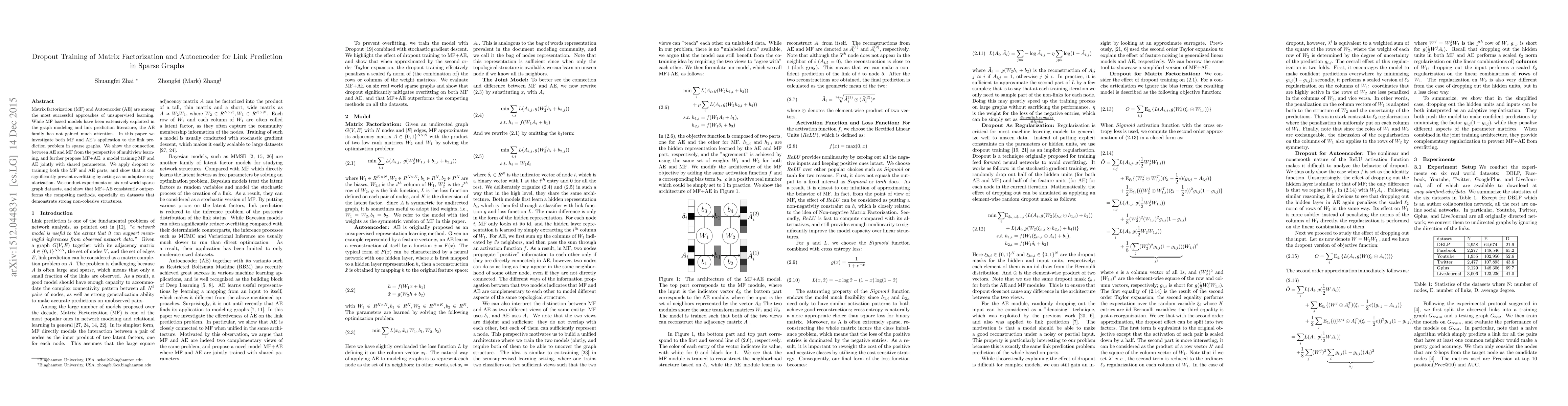 Matrix factorization (MF) and Autoencoder (AE) are among the most successful approaches of unsupervised learning. While MF based models have been extensively exploited in the graph modeling and link prediction literature, the AE family has not gained much attention. In this paper we investigate both MF and AE's application to the link prediction problem in sparse graphs. We show the connection between AE and MF from the perspective of multiview learning, and further propose MF+AE: a model training MF and AE jointly with shared parameters. We apply dropout to training both the MF and AE parts, and show that it can significantly prevent overfitting by acting as an adaptive regularization. We conduct experiments on six real world sparse graph datasets, and show that MF+AE consistently outperforms the competing methods, especially on datasets that demonstrate strong non-cohesive structures.