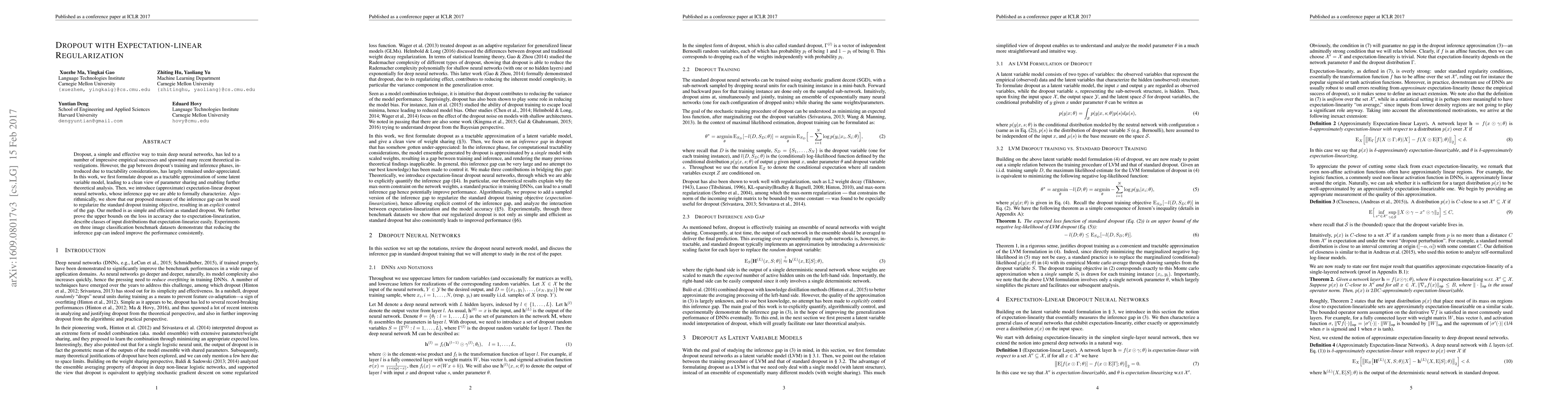 Dropout, a simple and effective way to train deep neural networks, has led to a number of impressive empirical successes and spawned many recent theoretical investigations. However, the gap between dropout's training and inference phases, introduced due to tractability considerations, has largely remained under-appreciated. In this work, we first formulate dropout as a tractable approximation of some latent variable model, leading to a clean view of parameter sharing and enabling further theoretical analysis. Then, we introduce (approximate) expectation-linear dropout neural networks, whose inference gap we are able to formally characterize. Algorithmically, we show that our proposed measure of the inference gap can be used to regularize the standard dropout training objective, resulting in an \emph{explicit} control of the gap. Our method is as simple and efficient as standard dropout. We further prove the upper bounds on the loss in accuracy due to expectation-linearization, describe classes of input distributions that expectation-linearize easily. Experiments on three image classification benchmark datasets demonstrate that reducing the inference gap can indeed improve the performance consistently.