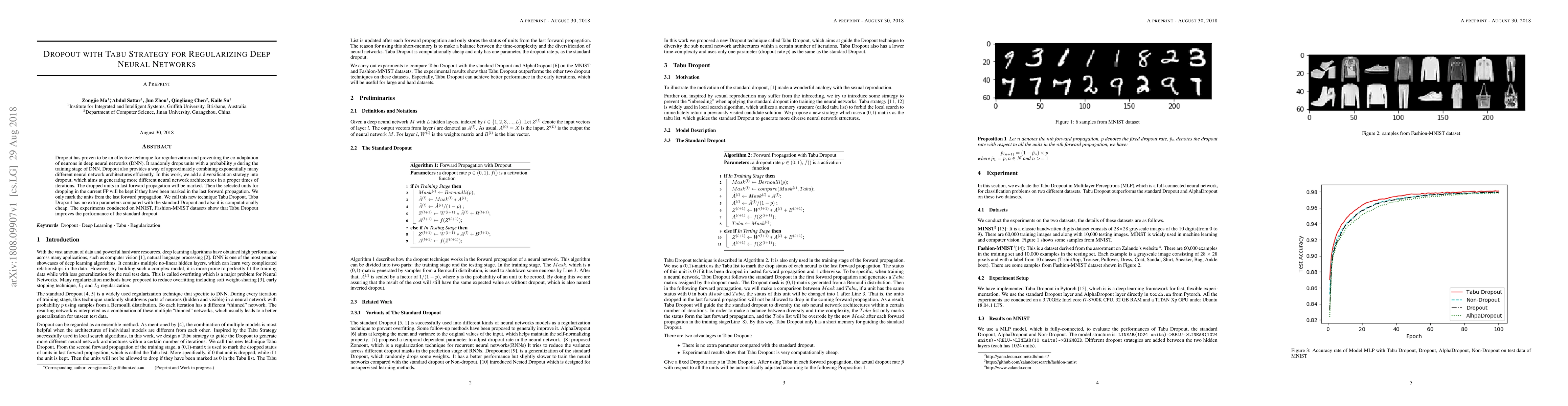 This paper introduces Tabu Dropout, a regularization technique for deep neural networks that combines dropout with a diversification strategy to generate more diverse neural architectures. Tabu Dropout marks units dropped in the last forward propagation and reuses them for future dropout decisions, improving performance without extra parameters or computational cost. Experiments on MNIST and Fashion-MNIST show enhanced results compared to standard dropout.