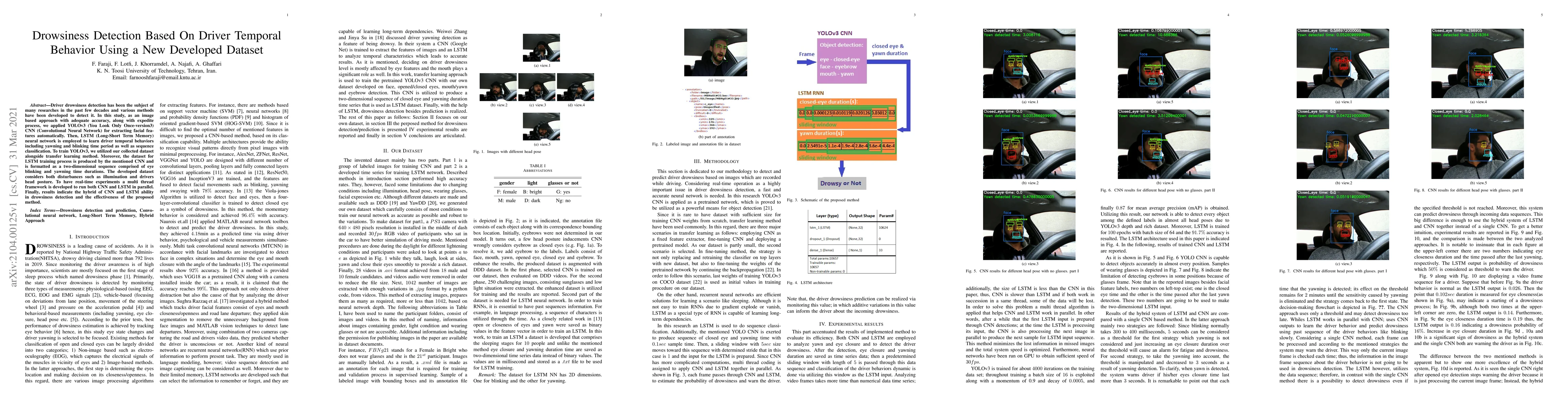 This paper proposes an image-based driver drowsiness detection method using YOLOv3 CNN for facial feature extraction and LSTM for learning temporal behaviors. The study introduces a new dataset considering various disturbances and employs a multi-thread framework for real-time processing, demonstrating the effectiveness of the hybrid approach.