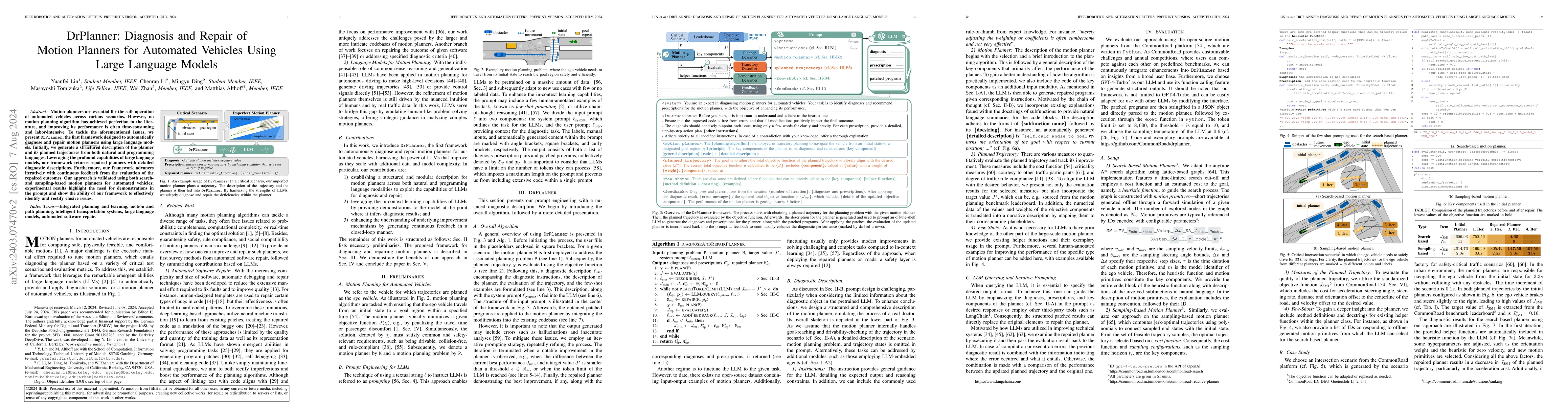 DrPlanner employs large language models to automatically diagnose and repair motion planners, generating structured descriptions and iteratively improving the planners' performance based on evaluation feedback. Experimental results show its effectiveness in identifying and fixing complex issues in search-based motion planners.