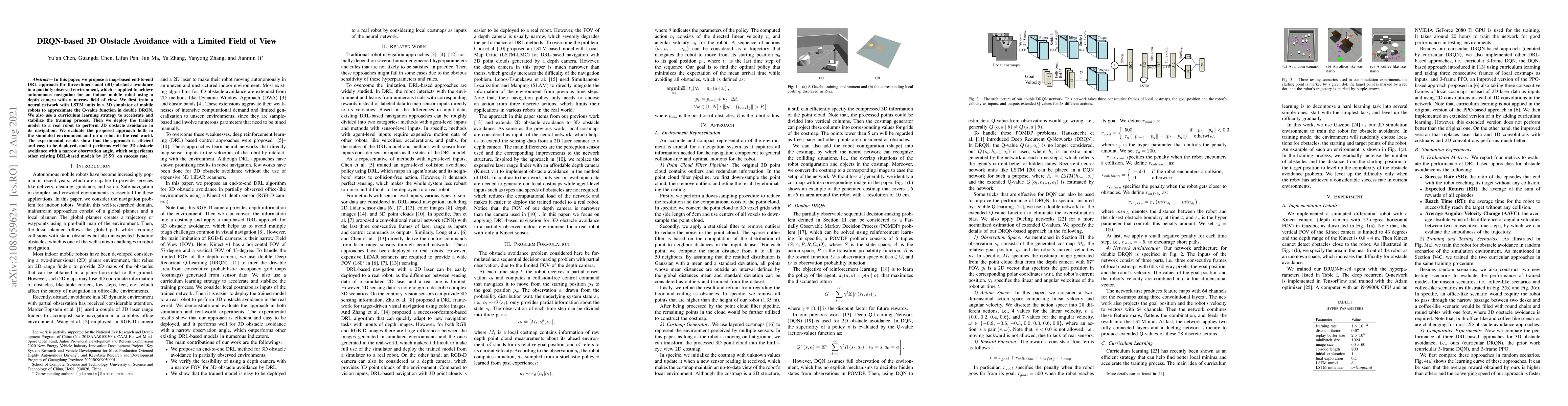 This paper proposes a map-based end-to-end DRL approach using DRQN for 3D obstacle avoidance in a partially observed environment, achieving autonomous navigation for an indoor mobile robot. The method outperforms existing models by 15.5% in success rate.