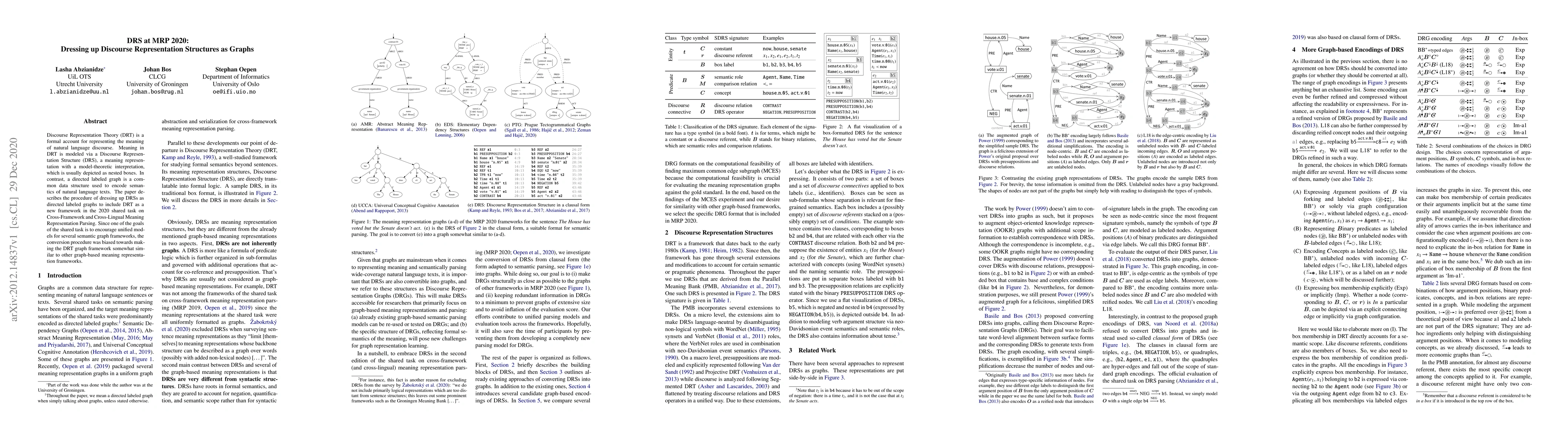 The paper details a method to convert Discourse Representation Structures (DRS) into directed labeled graphs to integrate DRT into the 2020 shared task on Cross-Framework and Cross-Lingual Meaning Representation Parsing, aiming to unify different semantic graph frameworks. The conversion emphasizes similarities with other graph-based meaning representation systems.
