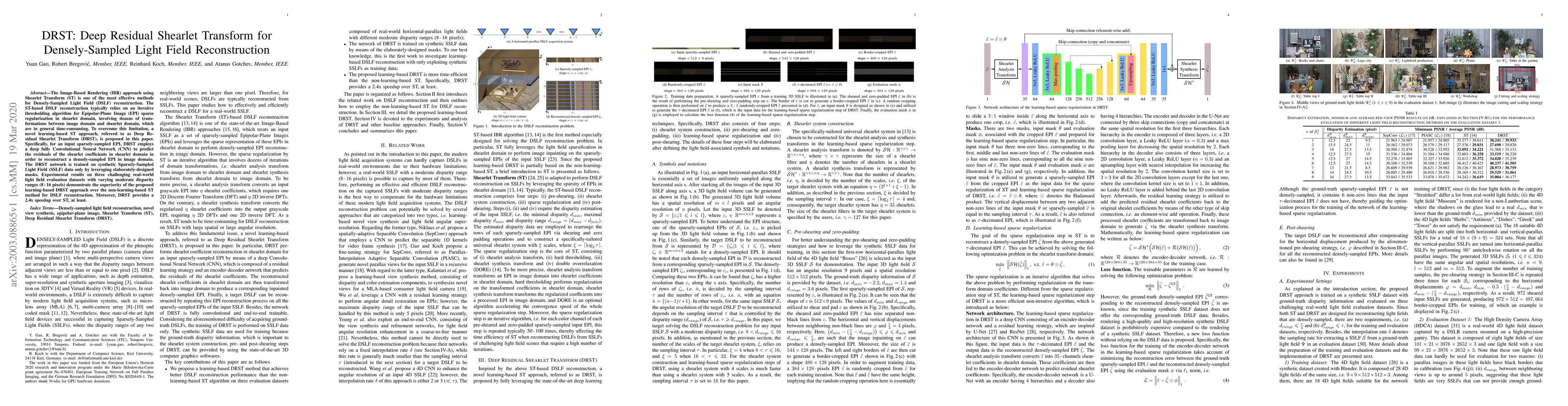 The paper proposes Deep Residual Shearlet Transform (DRST) for Densely Sampled Light Field (DSLF) reconstruction using a deep fully Convolutional Neural Network (CNN). DRST predicts residuals of shearlet coefficients in shearlet domain for a sparsely-sampled EPI to reconstruct a densely-sampled EPI in image domain, trained on synthetic Sparsely-Sampled Light Field (SSLF) data using elaborately-designed masks.
