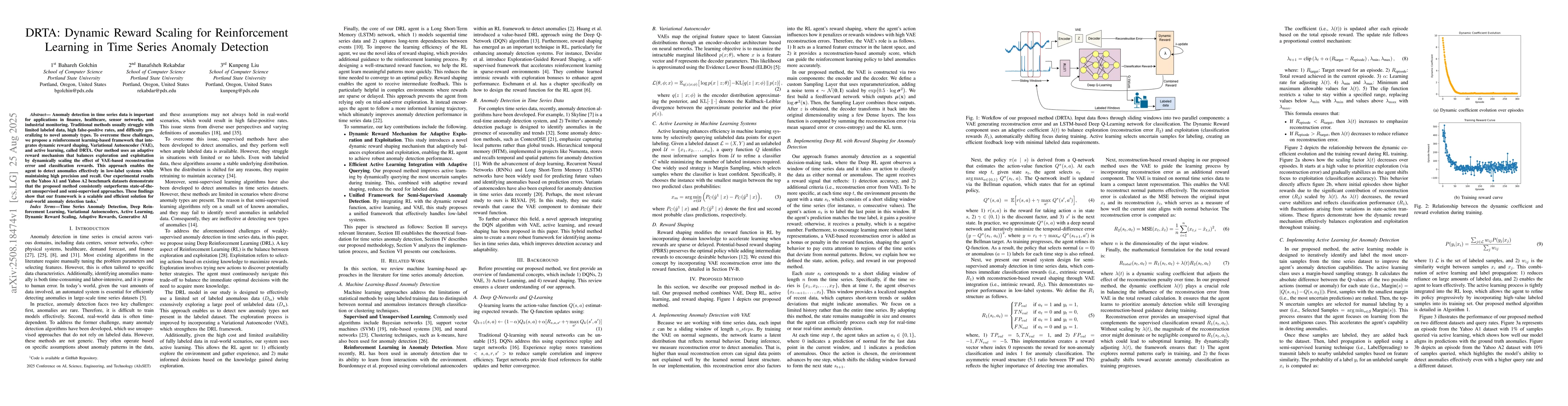 Anomaly detection in time series data is important for applications in finance, healthcare, sensor networks, and industrial monitoring. Traditional methods usually struggle with limited labeled data, high false-positive rates, and difficulty generalizing to novel anomaly types. To overcome these challenges, we propose a reinforcement learning-based framework that integrates dynamic reward shaping, Variational Autoencoder (VAE), and active learning, called DRTA. Our method uses an adaptive reward mechanism that balances exploration and exploitation by dynamically scaling the effect of VAE-based reconstruction error and classification rewards. This approach enables the agent to detect anomalies effectively in low-label systems while maintaining high precision and recall. Our experimental results on the Yahoo A1 and Yahoo A2 benchmark datasets demonstrate that the proposed method consistently outperforms state-of-the-art unsupervised and semi-supervised approaches. These findings show that our framework is a scalable and efficient solution for real-world anomaly detection tasks.