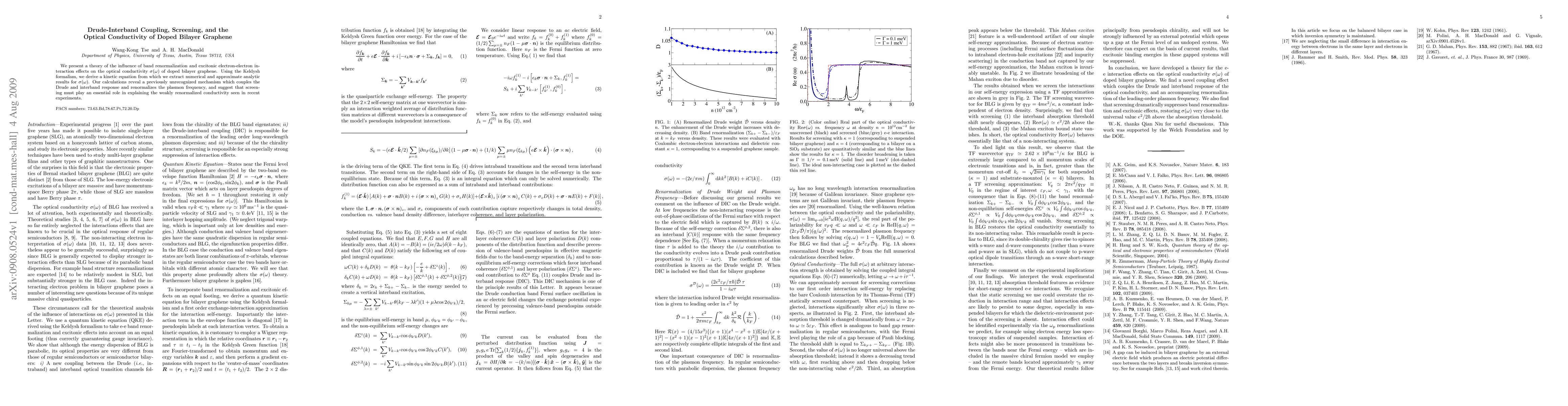 This paper develops a theoretical framework using the Keldysh formalism to analyze the optical conductivity of doped bilayer graphene, revealing a new mechanism that couples Drude and interband responses and renormalizes the plasmon frequency, emphasizing the importance of screening in explaining experimental observations.