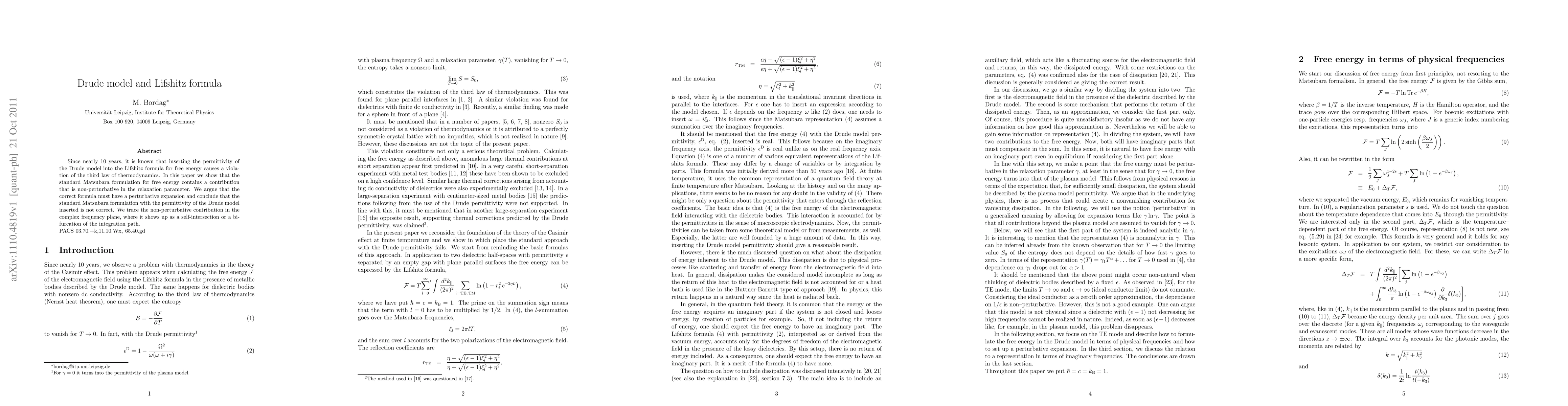 Since nearly 10 years, it is known that inserting the permittivity of the Drude model into the Lifshitz formula for free energy causes a violation of the third law of thermodynamics. In this paper we show that the standard Matsubara formulation for free energy contains a contribution that is non-perturbative in the relaxation parameter. We argue that the correct formula must have a perturbative expansion and conclude that the standard Matsubara formulation with the permittivity of the Drude model inserted is not correct. We trace the non-perturbative contribution in the complex frequency plane, where it shows up as a self-intersection or a bifurcation of the integration path.