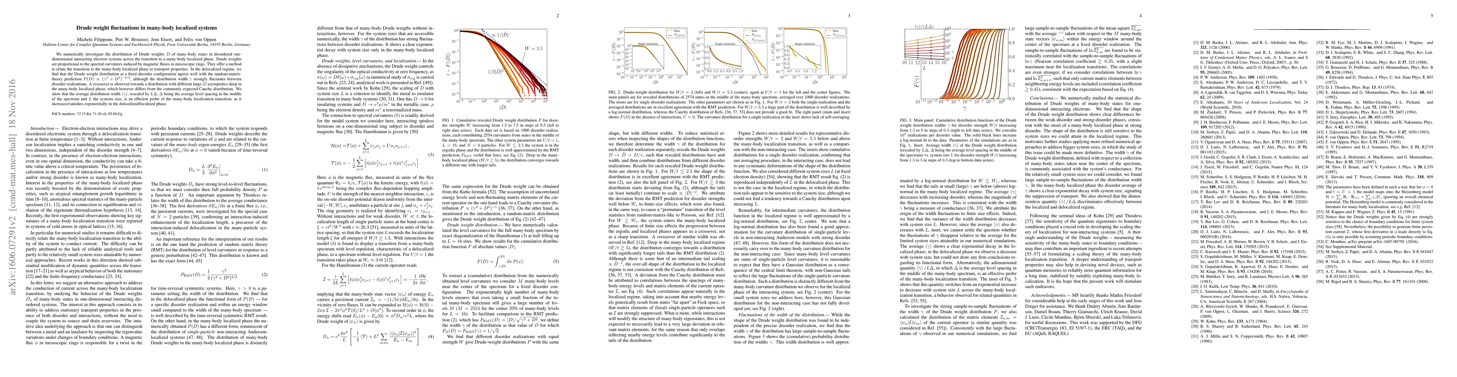 This paper numerically examines Drude weight fluctuations in disordered one-dimensional electron systems transitioning to a many-body localized phase, finding that the distribution width strongly fluctuates in the delocalized regime but shows a distinct crossover in the localized phase. The average distribution width rescaled by system size and level spacing is identified as an effective measure of the localization transition.