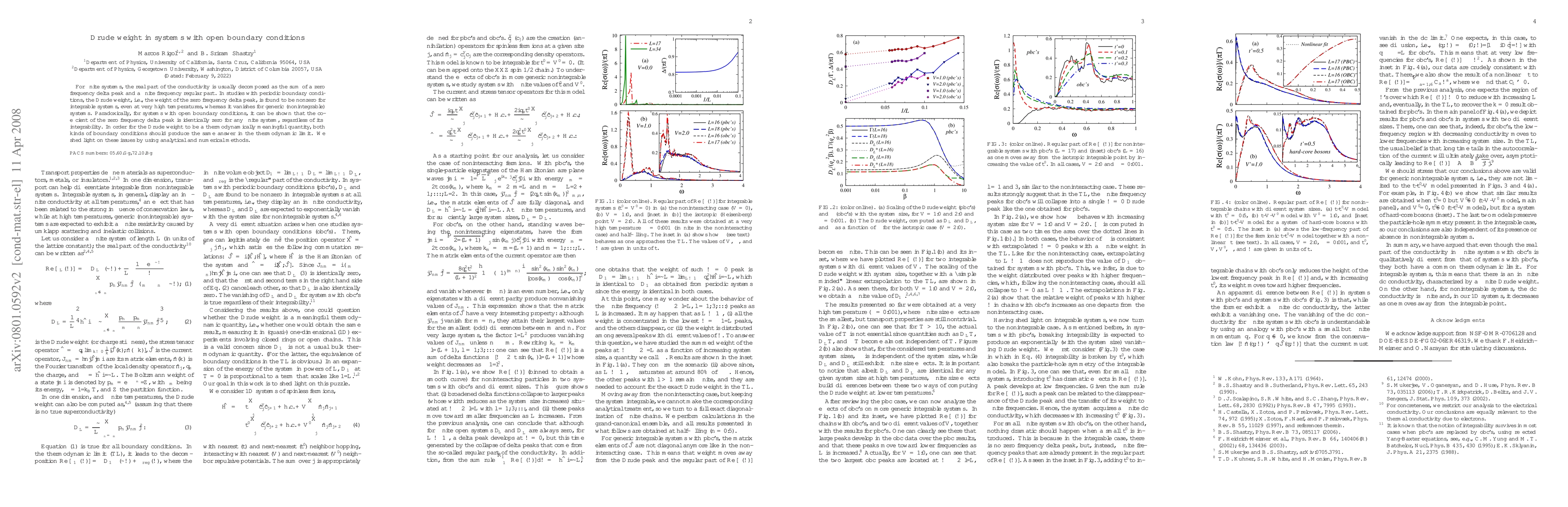 For finite systems, the real part of the conductivity is usually decomposed as the sum of a zero frequency delta peak and a finite frequency regular part. In studies with periodic boundary conditions, the Drude weight, i.e., the weight of the zero frequency delta peak, is found to be nonzero for integrable systems, even at very high temperatures, whereas it vanishes for generic (nonintegrable) systems. Paradoxically, for systems with open boundary conditions, it can be shown that the coefficient of the zero frequency delta peak is identically zero for any finite system, regardless of its integrability. In order for the Drude weight to be a thermodynamically meaningful quantity, both kinds of boundary conditions should produce the same answer in the thermodynamic limit. We shed light on these issues by using analytical and numerical methods.