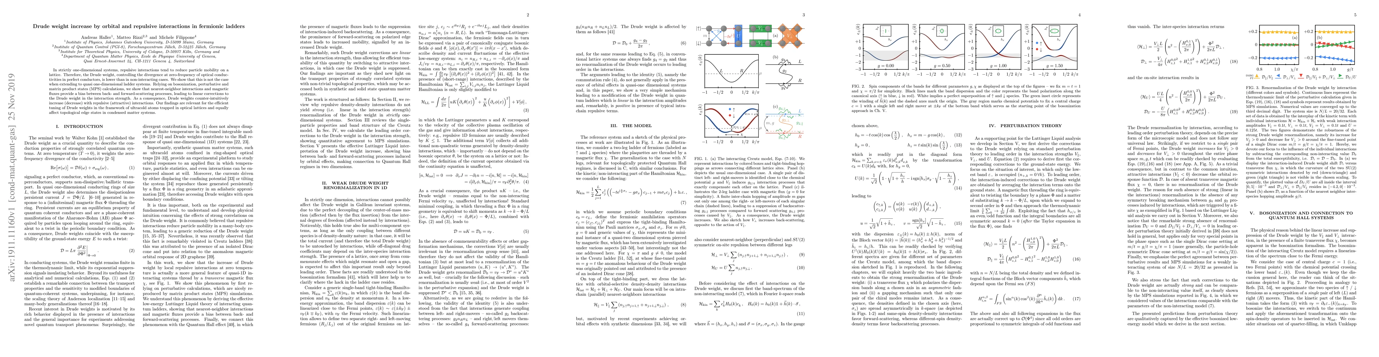 This paper demonstrates that in quasi one-dimensional fermionic ladder systems, repulsive interactions can increase the Drude weight, contrary to the behavior in strictly one-dimensional systems. Using bosonization, perturbative, and matrix product state calculations, the authors show that interactions and magnetic fluxes bias scattering processes, leading to an increase in Drude weight with repulsive interactions.