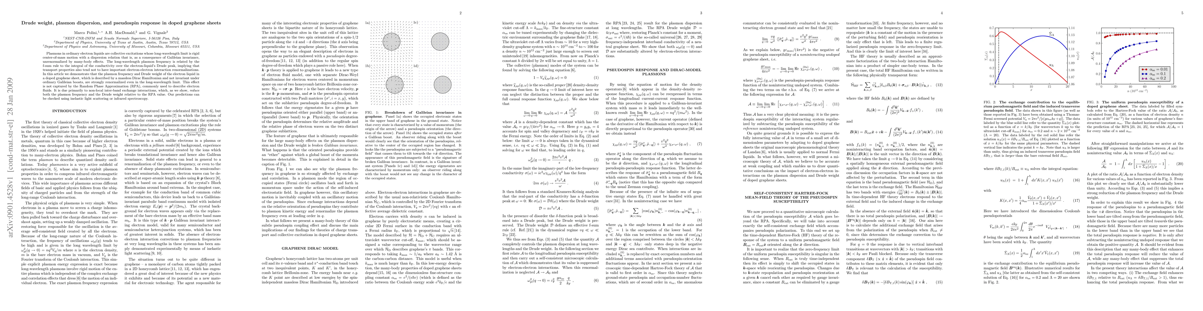 Plasmons in ordinary electron liquids are collective excitations whose long-wavelength limit is rigid center-of-mass motion with a dispersion relation that is, as a consequence of Galileian invariance, unrenormalized by many-body effects. The long-wavelength plasmon frequency is related by the f-sum rule to the integral of the conductivity over the electron-liquid's Drude peak, implying that transport properties also tend not to have important electron-electron interaction renormalizations. In this article we demonstrate that the plasmon frequency and Drude weight of the electron liquid in a doped graphene sheet, which is described by a massless Dirac Hamiltonian and not invariant under ordinary Galileian boosts, are strongly renormalized even in the long-wavelength limit. This effect is not captured by the Random Phase Approximation (RPA), commonly used to describe electron fluids. It is due primarily to non-local inter-band exchange interactions, which, as we show, reduce both the plasmon frequency and the Drude weight relative to the RPA value. Our predictions can be checked using inelastic light scattering or infrared spectroscopy.