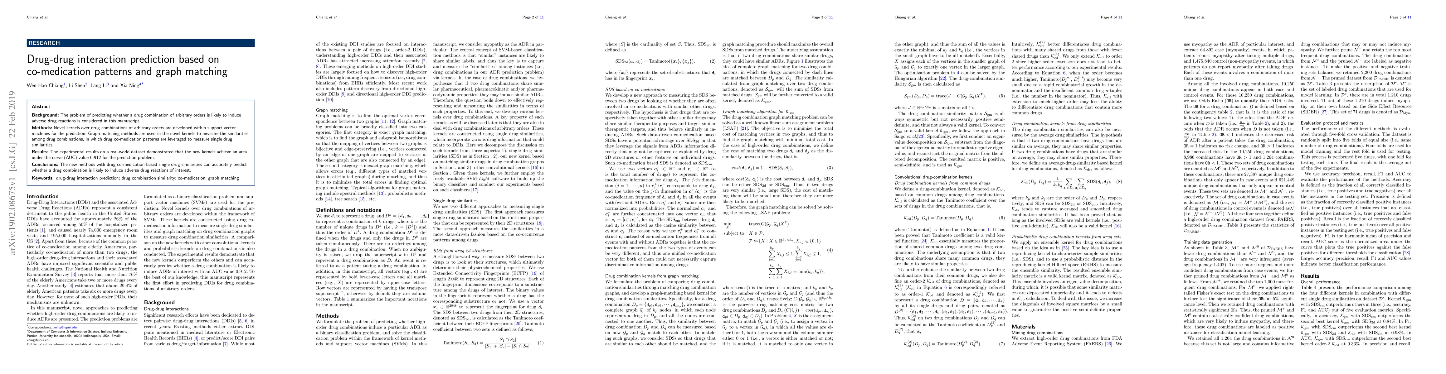 Summary: This paper introduces novel kernels for support vector machines that leverage co-medication patterns and graph matching to predict adverse drug reactions from drug combinations. Experimental results show an AUC value of 0.912, demonstrating the effectiveness of the proposed method.