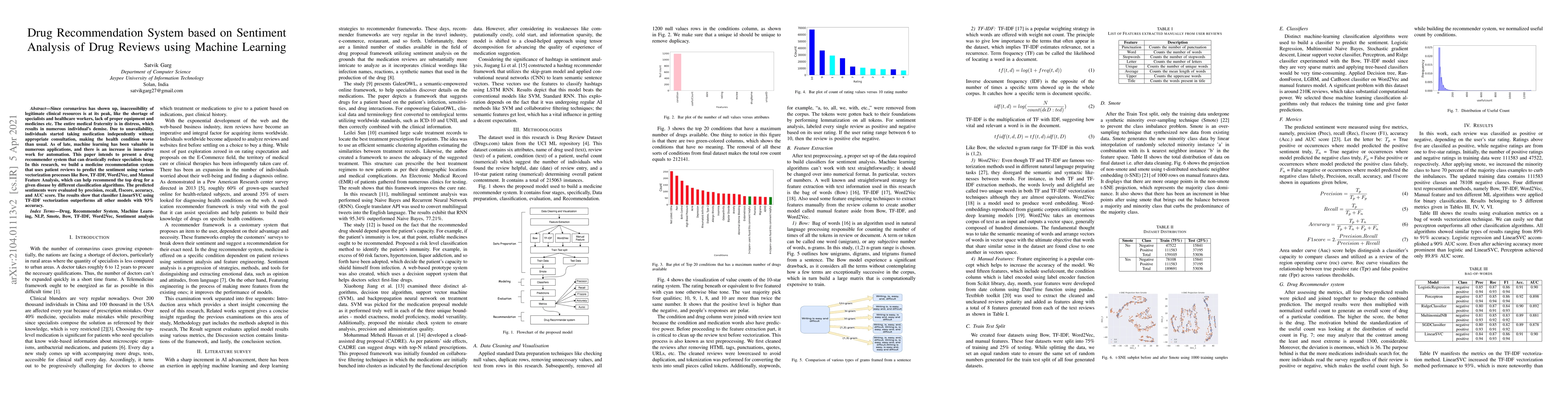 Since coronavirus has shown up, inaccessibility of legitimate clinical resources is at its peak, like the shortage of specialists, healthcare workers, lack of proper equipment and medicines. The entire medical fraternity is in distress, which results in numerous individuals demise. Due to unavailability, people started taking medication independently without appropriate consultation, making the health condition worse than usual. As of late, machine learning has been valuable in numerous applications, and there is an increase in innovative work for automation. This paper intends to present a drug recommender system that can drastically reduce specialists heap. In this research, we build a medicine recommendation system that uses patient reviews to predict the sentiment using various vectorization processes like Bow, TFIDF, Word2Vec, and Manual Feature Analysis, which can help recommend the top drug for a given disease by different classification algorithms. The predicted sentiments were evaluated by precision, recall, f1score, accuracy, and AUC score. The results show that classifier LinearSVC using TFIDF vectorization outperforms all other models with 93% accuracy.
