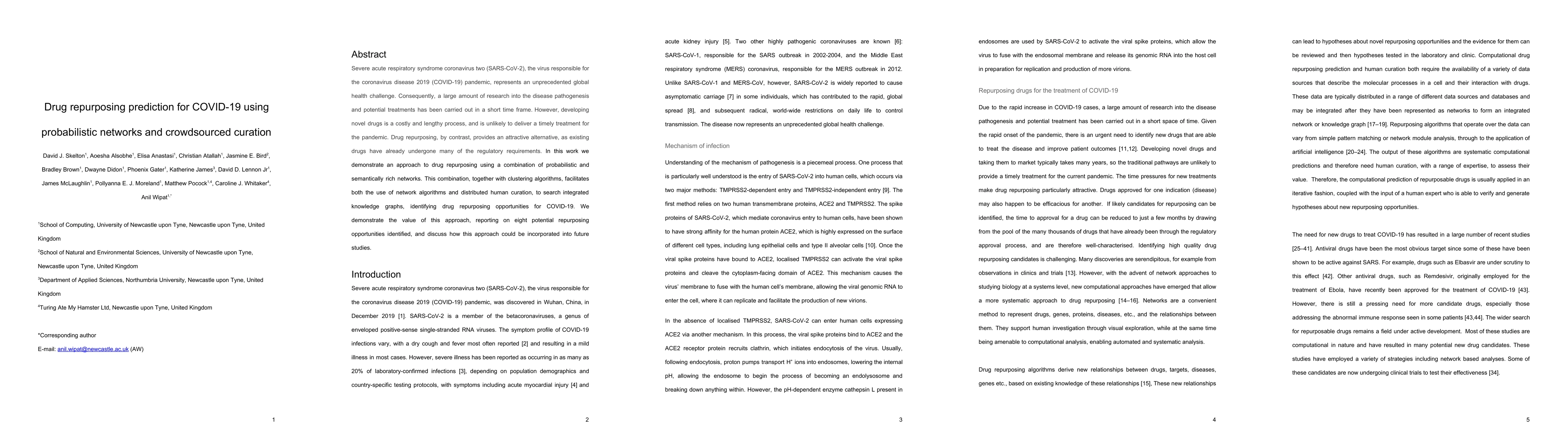 This paper explores drug repurposing for COVID-19 using probabilistic networks and crowdsourced curation, identifying eight potential drug candidates. It combines network algorithms with human expertise to expedite treatment discovery, offering a viable alternative to developing new drugs.