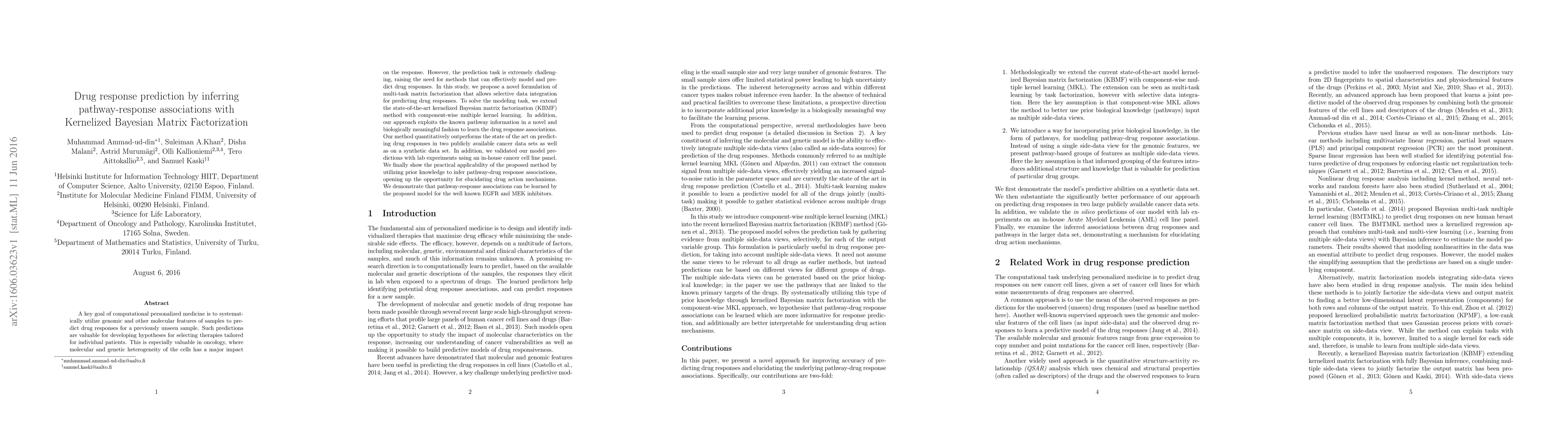A new method using kernelized Bayesian matrix factorization with component-wise multiple kernel learning predicts drug responses based on genomic and molecular features of samples, outperforming existing methods in cancer data sets and lab experiments.