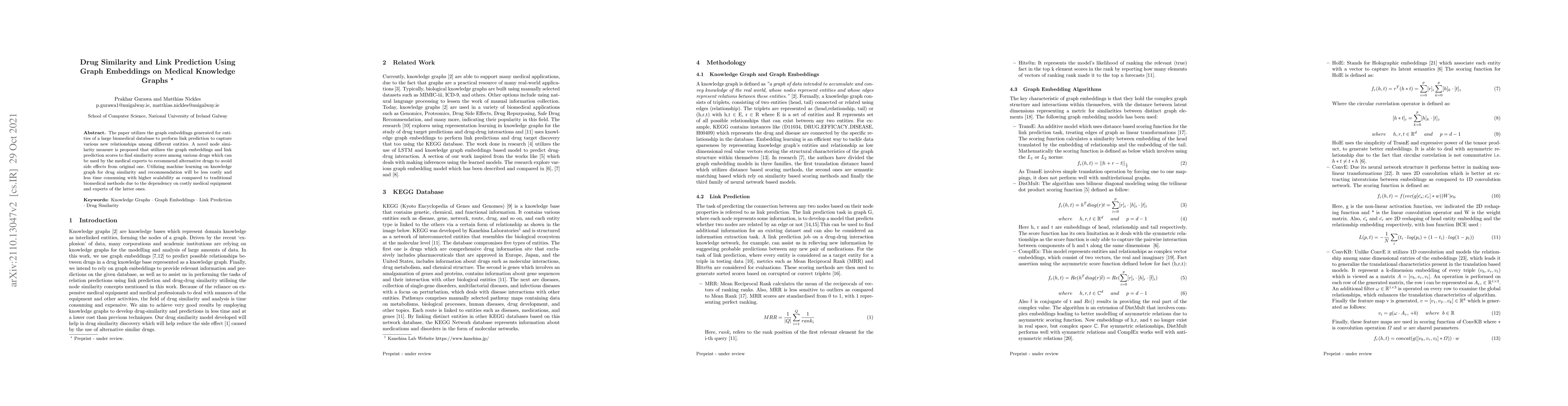 This paper proposes a novel method for drug similarity and link prediction using graph embeddings on medical knowledge graphs, aiming to recommend alternative drugs to avoid side effects. It leverages machine learning to achieve higher scalability and lower costs compared to traditional biomedical methods.