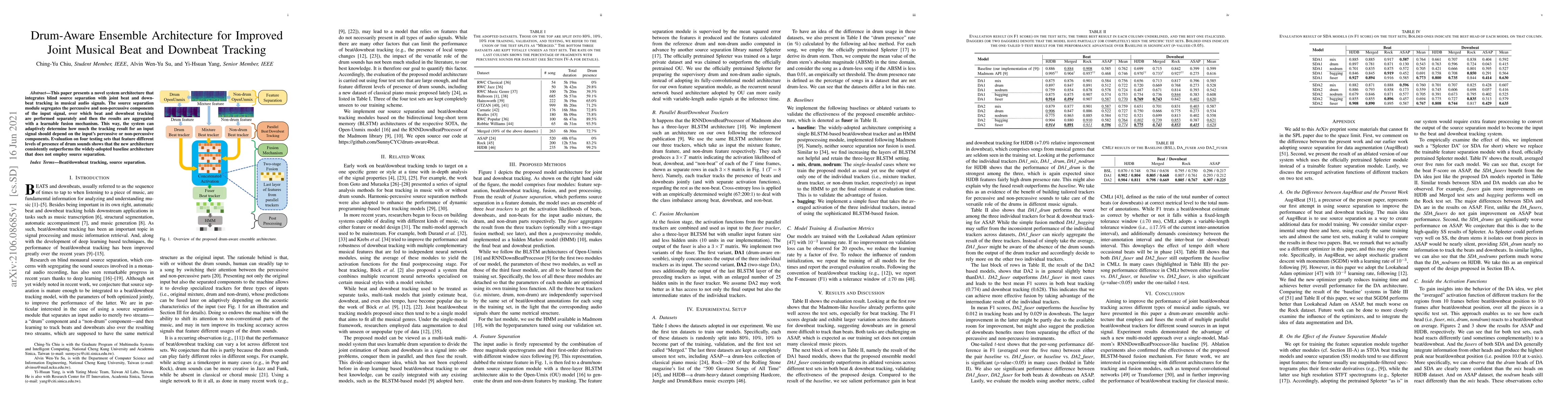 A new system architecture improves joint musical beat and downbeat tracking by integrating blind source separation with separate processing of percussive and non-percussive components.
