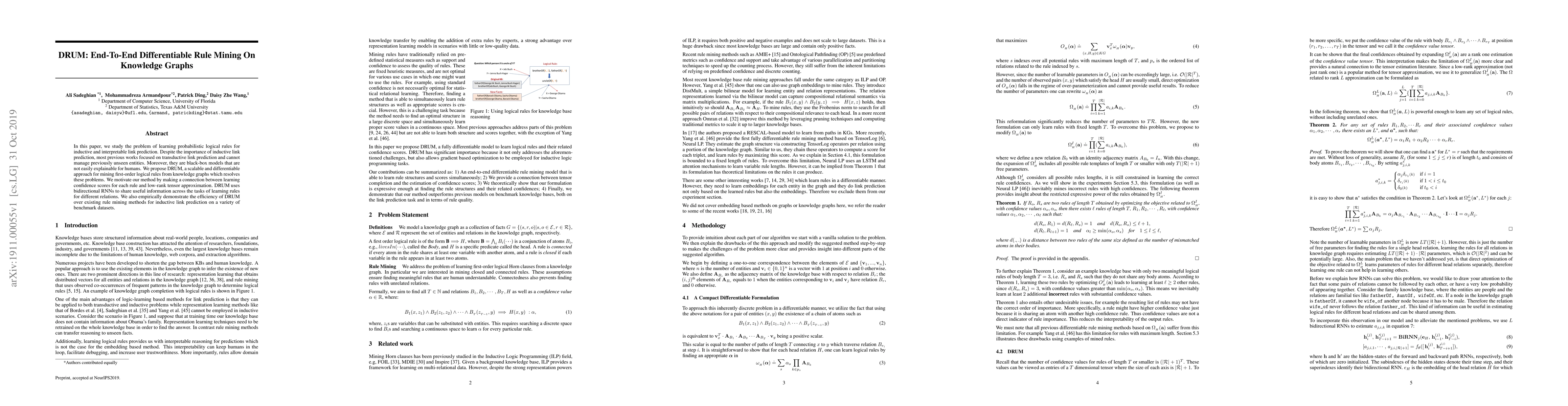 DRUM is a scalable, differentiable approach for mining interpretable logical rules from knowledge graphs for inductive link prediction. It leverages bidirectional RNNs and connects rule learning to low-rank tensor approximation, outperforming existing methods in efficiency and interpretability.