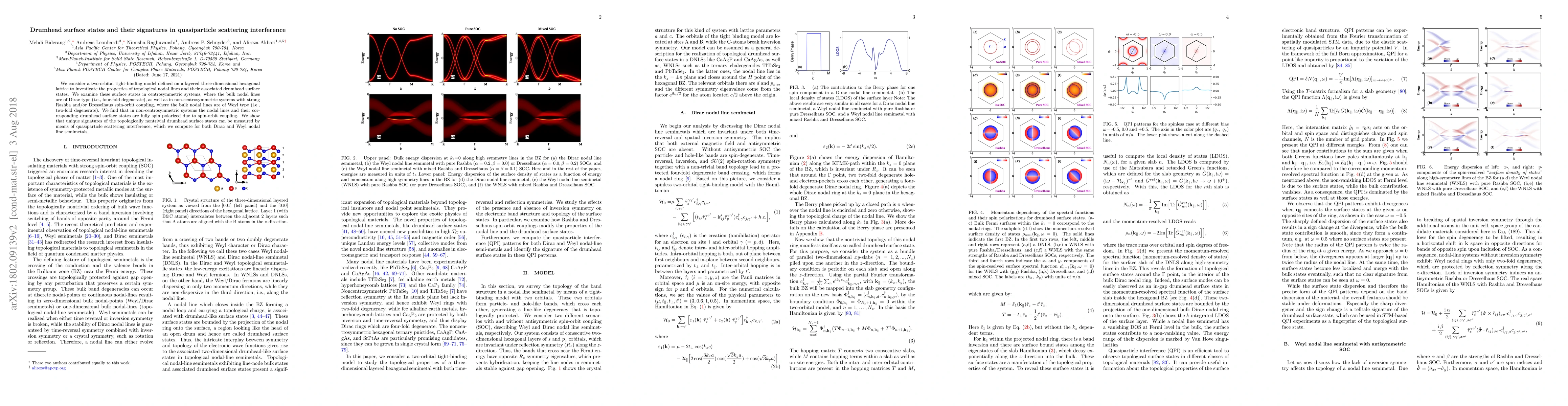 This paper investigates topological nodal lines and drumhead surface states in two-orbital models on hexagonal lattices, finding spin polarization in non-centrosymmetric systems due to spin-orbit coupling. It demonstrates unique quasiparticle scattering interference signatures for both Dirac and Weyl semimetals.