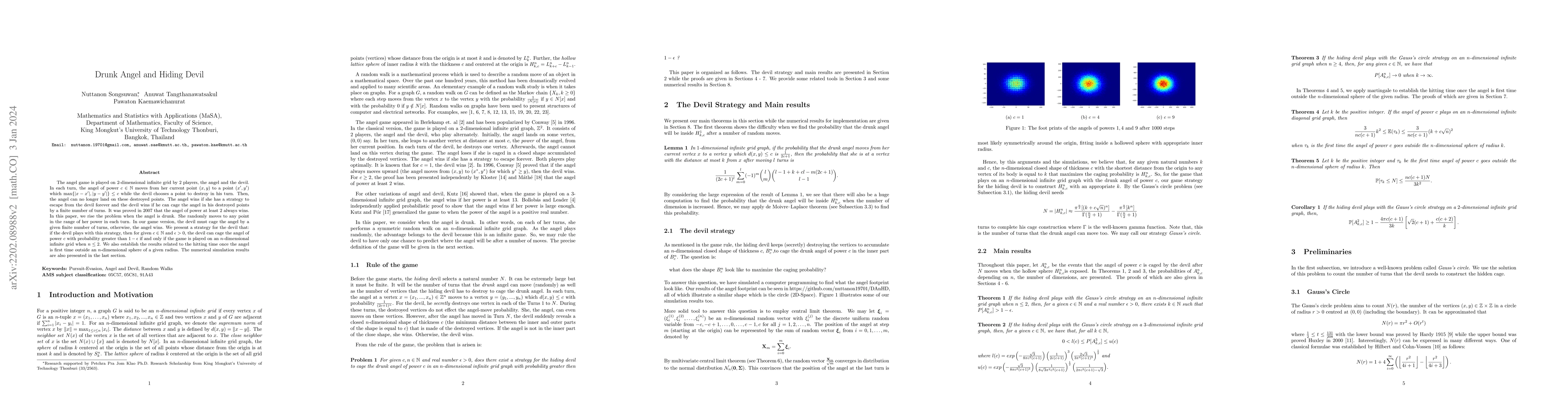 The paper presents a novel strategy for the devil in the drunk angel game on n-dimensional infinite grid graphs, along with theoretical analysis and numerical simulations.