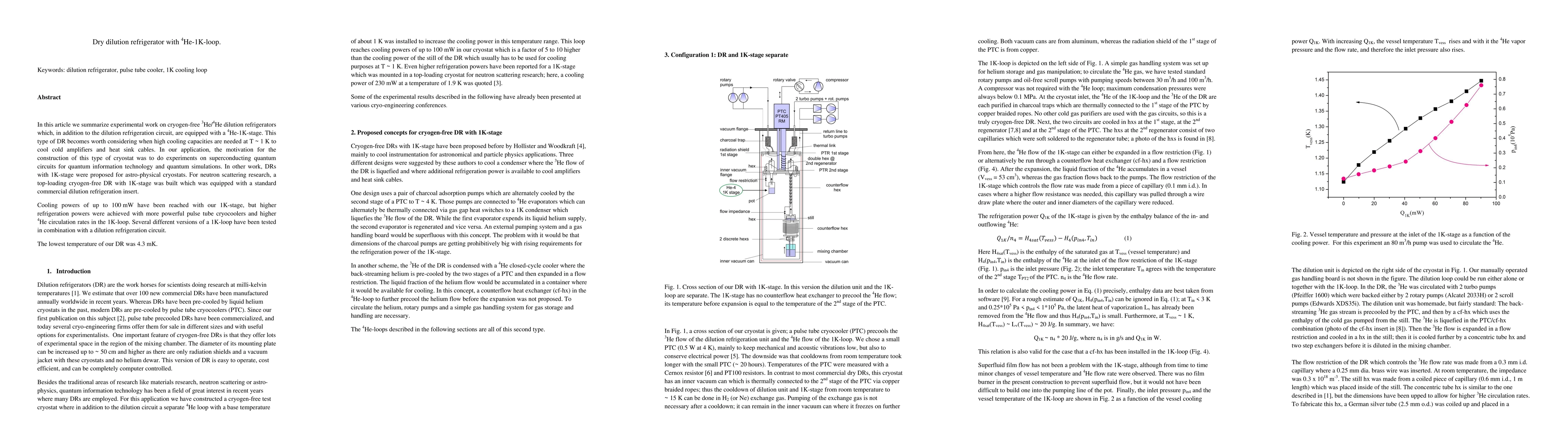 This paper presents experimental results on a dry dilution refrigerator with a 4He-1K-loop, designed to achieve high cooling capacities at ~1 K for superconducting quantum circuits. It reports cooling powers up to 100 mW and the lowest temperature of 4.3 mK, demonstrating its potential for quantum information technology and neutron scattering research.
