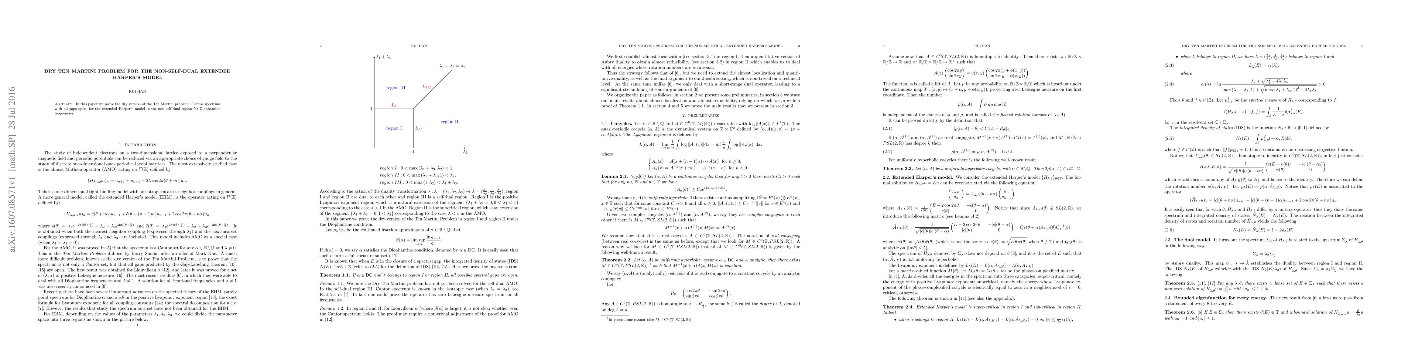 In this paper we prove the dry version of the Ten Martini problem: Cantor spectrum with all gaps open, for the extended Harper's model in the non self-dual region for Diophantine frequencies.