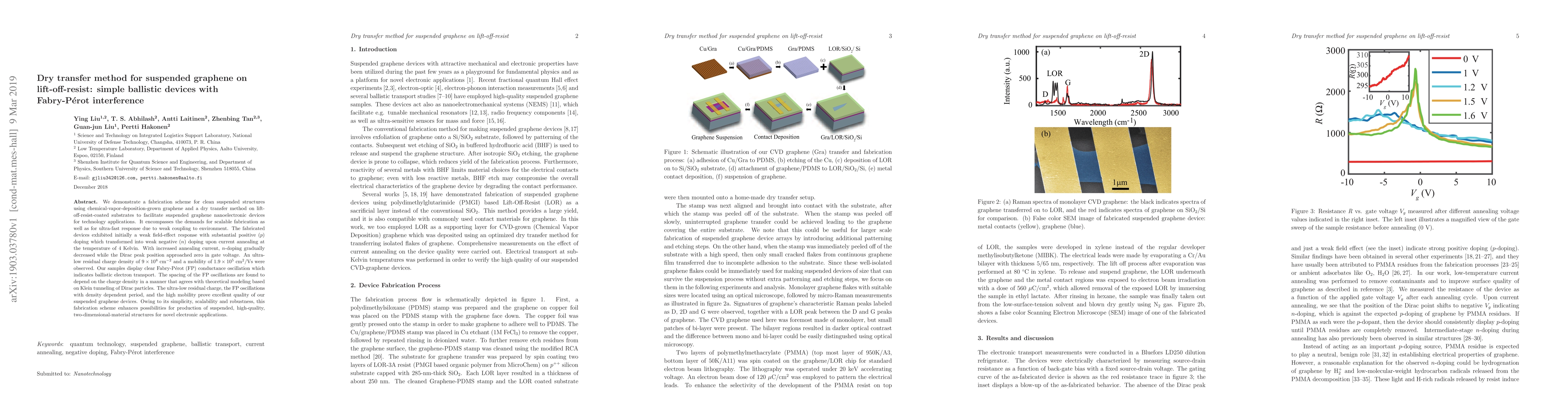 The paper presents a simple, scalable fabrication method for high-quality suspended graphene devices using dry transfer on lift-off-resist. These devices, featuring Fabry-Pérot interference, exhibit ballistic electron transport, ultra-low residual charge density, and high mobility, opening avenues for advanced electronic applications.