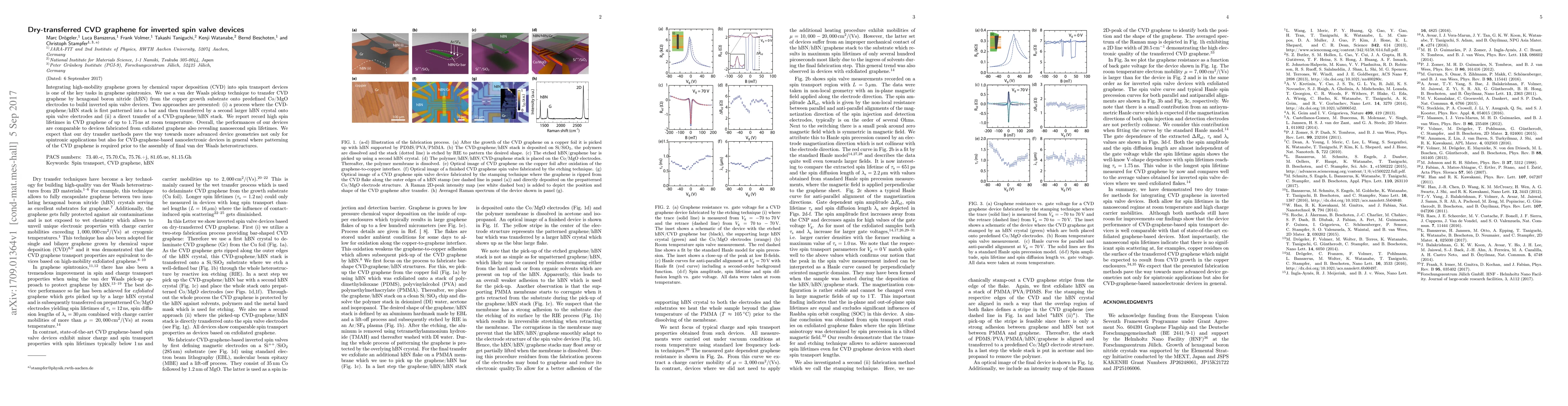 This paper details the integration of dry-transferred CVD graphene into inverted spin valve devices using a van der Waals method, achieving record high spin lifetimes of 1.75 ns at room temperature. The study explores two transfer techniques and suggests these methods could enable advanced device designs for spintronics and nanoelectronics.
