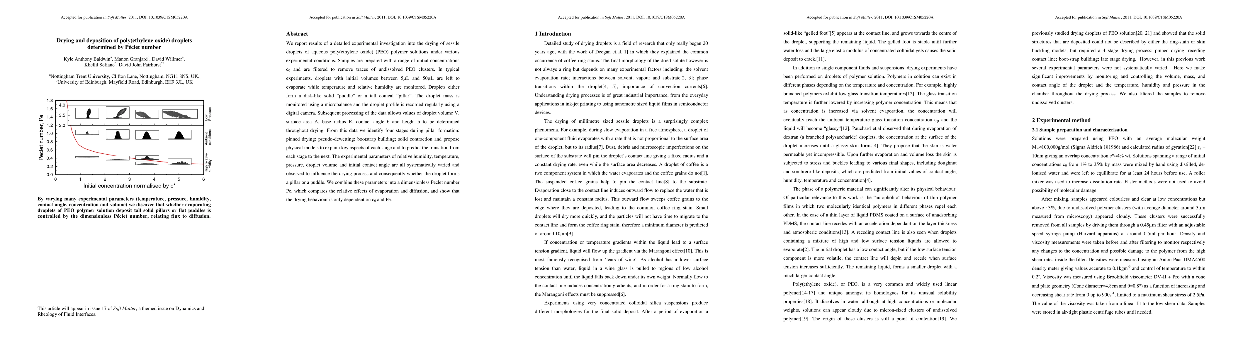 We report results of a detailed experimental investigation into the drying of sessile droplets of aqueous poly(ethylene oxide) (PEO) polymer solutions under various experimental conditions. Samples are prepared with a range of initial concentrations c_0 and are filtered to remove traces of undissolved PEO clusters. In typical experiments, droplets with initial volumes between 5\muL and 50\muL are left to evaporate while temperature and relative humidity are monitored. Droplets either form a disk-like solid "puddle" or a tall conical "pillar". The droplet mass is monitored using a microbalance and the droplet profile is recorded regularly using a digital camera. Subsequent processing of the data allows values of droplet volume V, surface area A, base radius R, contact angle {\theta} and height h to be determined throughout drying. From this data we identify four stages during pillar formation: pinned drying; pseudo-dewetting; bootstrap building; solid contraction and propose physical models to explain key aspects of each stage and to predict the transition from each stage to the next. The experimental parameters of relative humidity, temperature, pressure, droplet volume and initial contact angle are all systematically varied and observed to influence the drying process and consequently whether the droplet forms a pillar or a puddle. We combine these parameters into a dimensionless P\'eclet number Pe, which compares the relative effects of evaporation and diffusion, and show that the drying behaviour is only dependent on c_0 and Pe.
