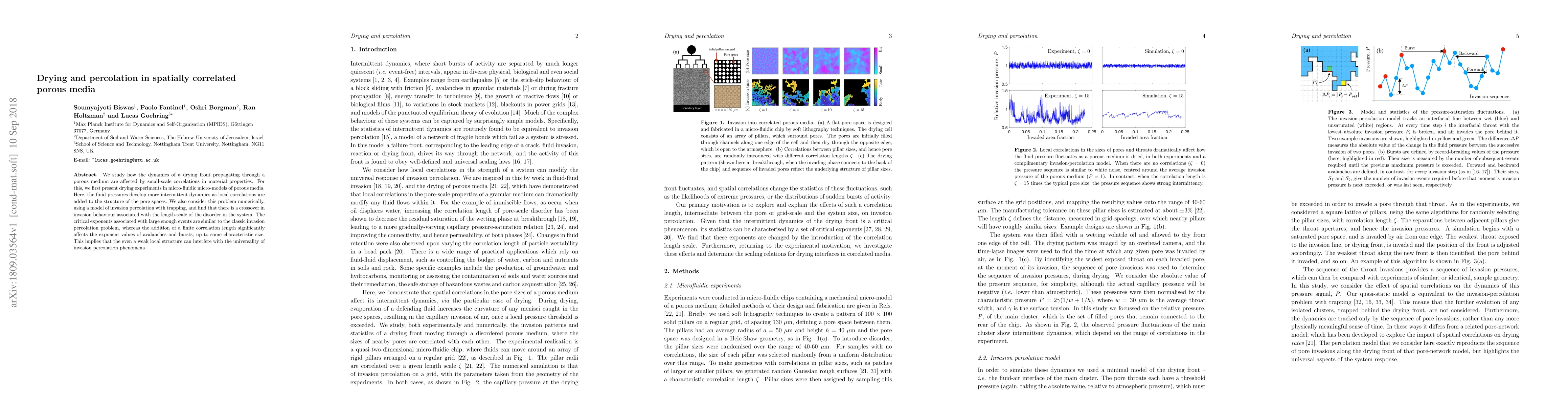 The paper presents a detailed analysis of drying and percolation dynamics in spatially correlated porous media, combining experimental and numerical approaches to understand the influence of local correlations on pressure signal variability and critical exponents.
