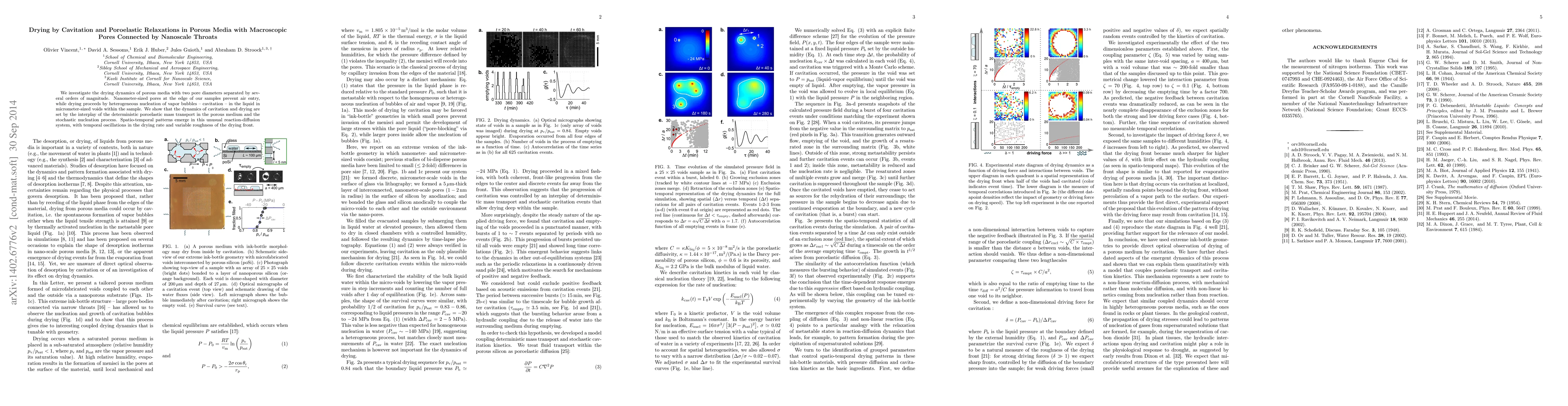 We investigate the drying dynamics of porous media with two pore diameters separated by several orders of magnitude. Nanometer-sized pores at the edge of our samples prevent air entry, while drying proceeds by heterogeneous nucleation of vapor bubbles (cavitation) in the liquid in micrometer-sized voids within the sample. We show that the dynamics of cavitation and drying are set by the interplay of the deterministic poroelastic mass transport in the porous medium and the stochastic nucleation process. Spatio-temporal patterns emerge in this unusual reaction-diffusion system, with temporal oscillations in the drying rate and variable roughness of the drying front.