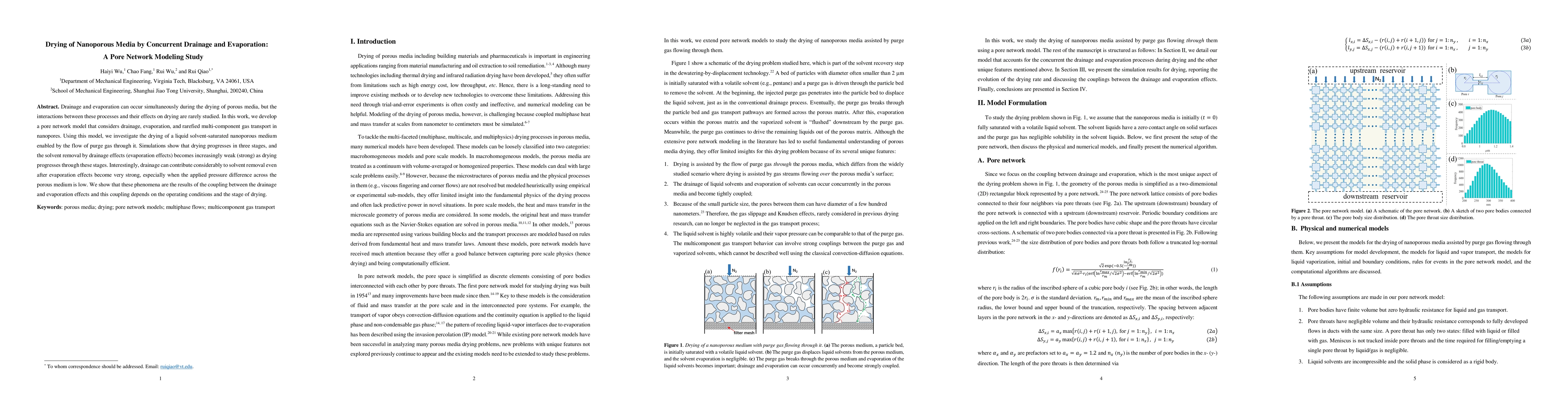 This study develops a pore network model to simulate the drying of porous media through concurrent drainage and evaporation, revealing three drying stages where drainage and evaporation effects interplay, with drainage significantly aiding solvent removal even when evaporation is strong, especially under low pressure differences.
