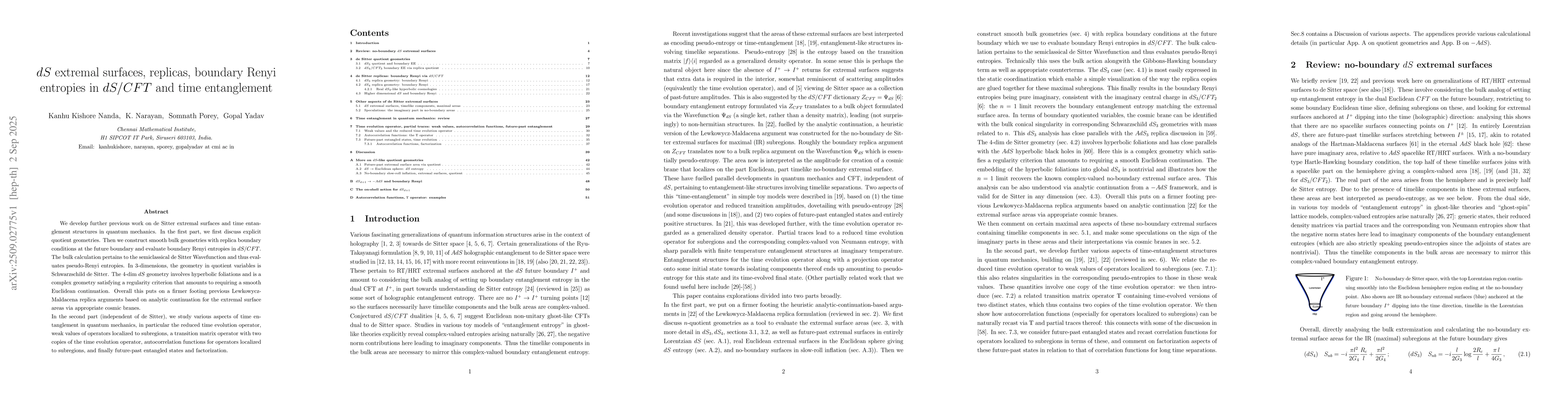 We develop further previous work on de Sitter extremal surfaces and time entanglement structures in quantum mechanics. In the first part, we first discuss explicit quotient geometries. Then we construct smooth bulk geometries with replica boundary conditions at the future boundary and evaluate boundary Renyi entropies in $dS/CFT$. The bulk calculation pertains to the semiclassical de Sitter Wavefunction and thus evaluates pseudo-Renyi entropies. In 3-dimensions, the geometry in quotient variables is Schwarzschild de Sitter. The 4-dim $dS$ geometry involves hyperbolic foliations and is a complex geometry satisfying a regularity criterion that amounts to requiring a smooth Euclidean continuation. Overall this puts on a firmer footing previous Lewkowycz-Maldacena replica arguments based on analytic continuation for the extremal surface areas via appropriate cosmic branes. In the second part (independent of de Sitter), we study various aspects of time entanglement in quantum mechanics, in particular the reduced time evolution operator, weak values of operators localized to subregions, a transition matrix operator with two copies of the time evolution operator, autocorrelation functions for operators localized to subregions, and finally future-past entangled states and factorization.