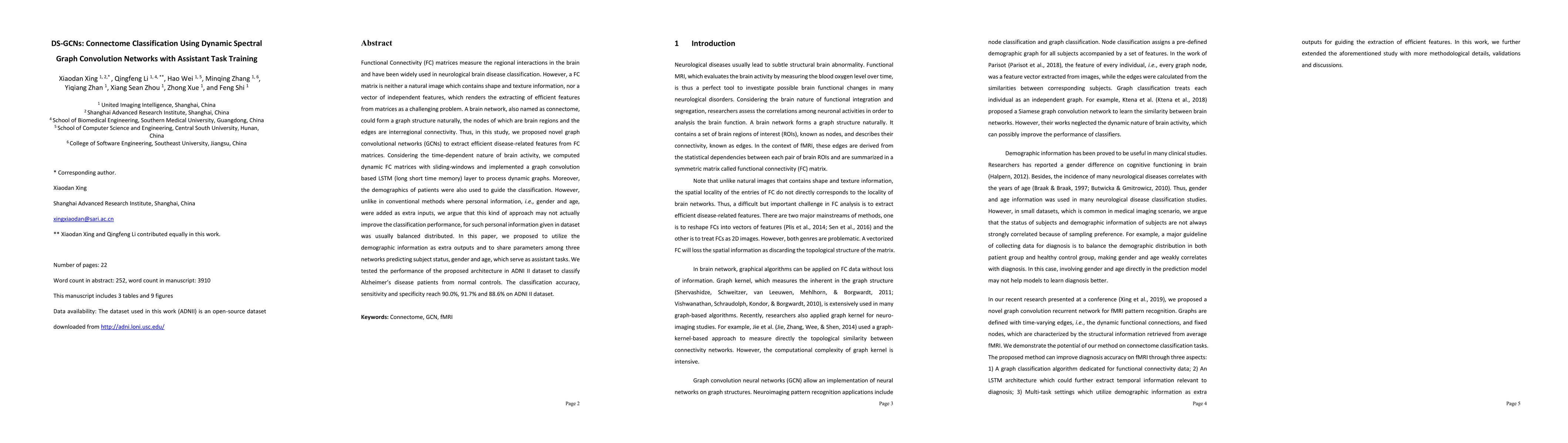 Functional Connectivity (FC) matrices measure the regional interactions in the brain and have been widely used in neurological brain disease classification. However, a FC matrix is neither a natural image which contains shape and texture information, nor a vector of independent features, which renders the extracting of efficient features from matrices as a challenging problem. A brain network, also named as connectome, could forma a graph structure naturally, the nodes of which are brain regions and the edges are interregional connectivity. Thus, in this study, we proposed novel graph convolutional networks (GCNs) to extract efficient disease-related features from FC matrices. Considering the time-dependent nature of brain activity, we computed dynamic FC matrices with sliding-windows and implemented a graph convolution based LSTM (long short term memory) layer to process dynamic graphs. Moreover, the demographics of patients were also used to guide the classification. However, unlike in conventional methods where personal information, i.e., gender and age were added as extra inputs, we argue that this kind of approach may not actually improve the classification performance, for such personal information given in dataset was usually balanced distributed. In this paper, we proposed to utilize the demographic information as extra outputs and to share parameters among three networks predicting subject status, gender and age, which serve as assistant tasks. We tested the performance of the proposed architecture in ADNI II dataset to classify Alzheimer's disease patients from normal controls. The classification accuracy, sensitivity and specificity reach 0.90, 0.92 and 0.89 on ADNI II dataset.