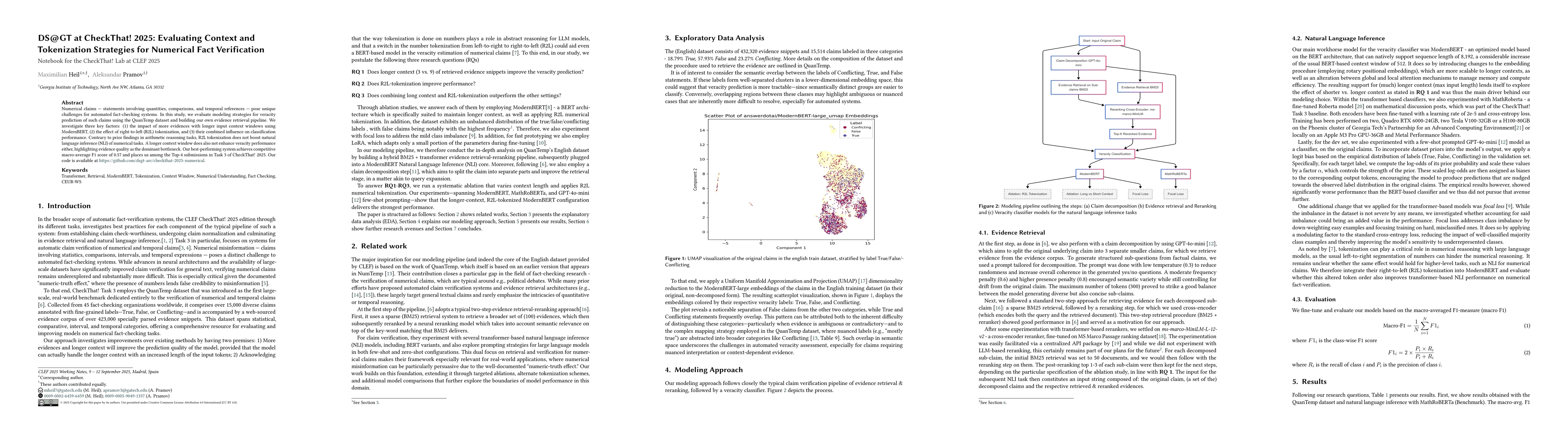 Numerical claims, statements involving quantities, comparisons, and temporal references, pose unique challenges for automated fact-checking systems. In this study, we evaluate modeling strategies for veracity prediction of such claims using the QuanTemp dataset and building our own evidence retrieval pipeline. We investigate three key factors: (1) the impact of more evidences with longer input context windows using ModernBERT, (2) the effect of right-to-left (R2L) tokenization, and (3) their combined influence on classification performance. Contrary to prior findings in arithmetic reasoning tasks, R2L tokenization does not boost natural language inference (NLI) of numerical tasks. A longer context window does also not enhance veracity performance either, highlighting evidence quality as the dominant bottleneck. Our best-performing system achieves competitive macro-average F1 score of 0.57 and places us among the Top-4 submissions in Task 3 of CheckThat! 2025. Our code is available at https://github.com/dsgt-arc/checkthat-2025-numerical.