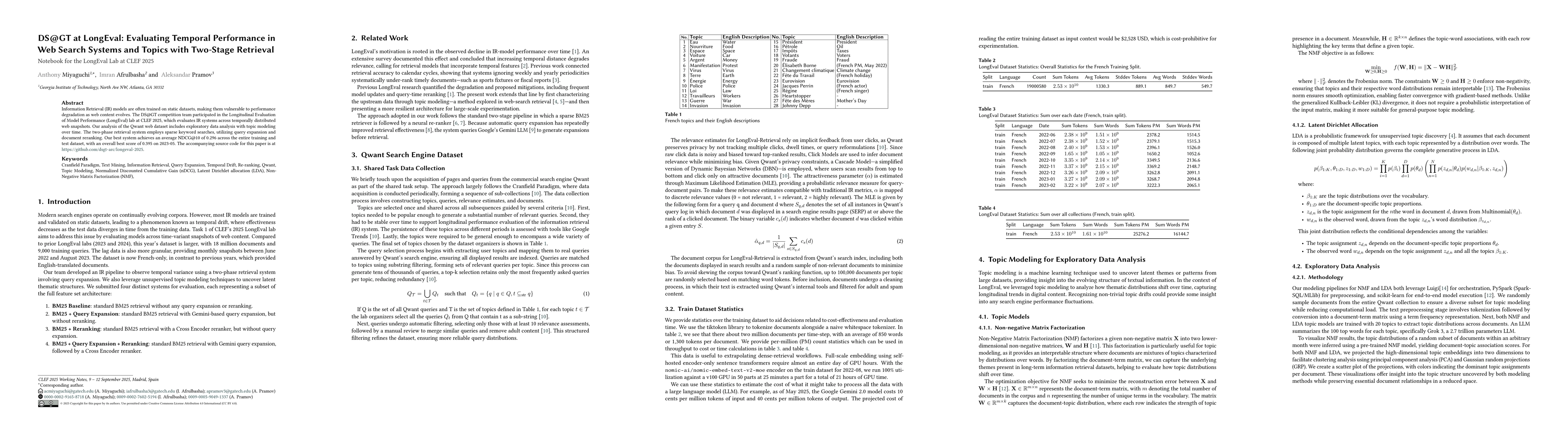 Information Retrieval (IR) models are often trained on static datasets, making them vulnerable to performance degradation as web content evolves. The DS@GT competition team participated in the Longitudinal Evaluation of Model Performance (LongEval) lab at CLEF 2025, which evaluates IR systems across temporally distributed web snapshots. Our analysis of the Qwant web dataset includes exploratory data analysis with topic modeling over time. The two-phase retrieval system employs sparse keyword searches, utilizing query expansion and document reranking. Our best system achieves an average NDCG@10 of 0.296 across the entire training and test dataset, with an overall best score of 0.395 on 2023-05. The accompanying source code for this paper is at https://github.com/dsgt-arc/longeval-2025